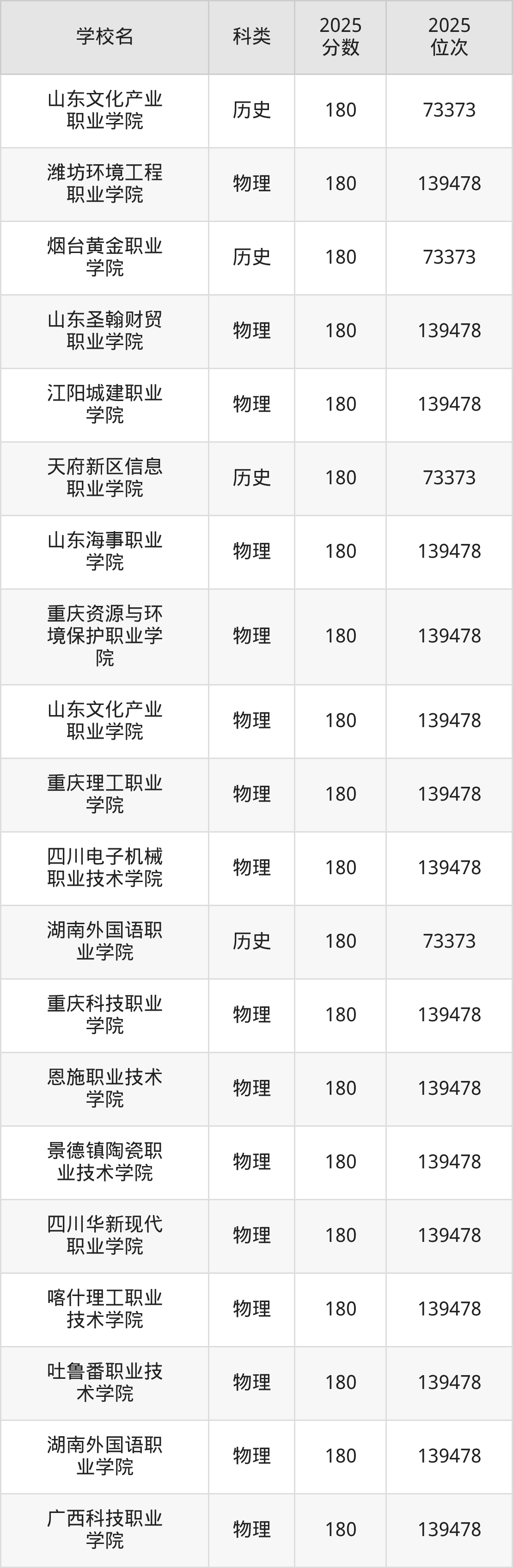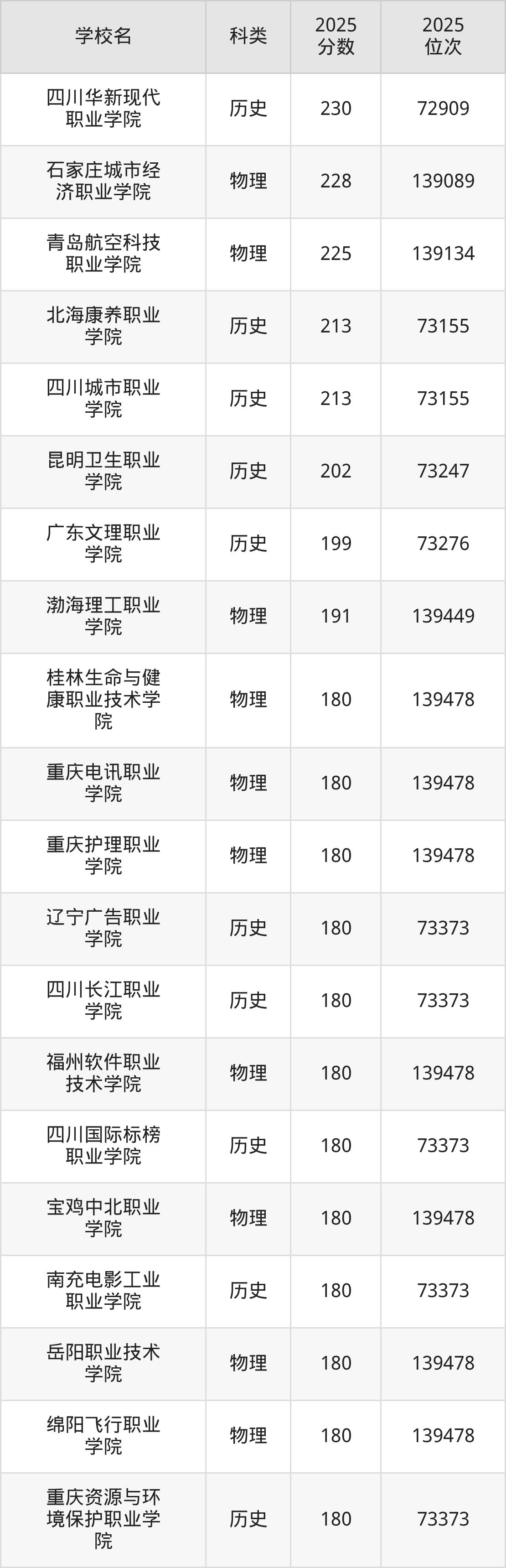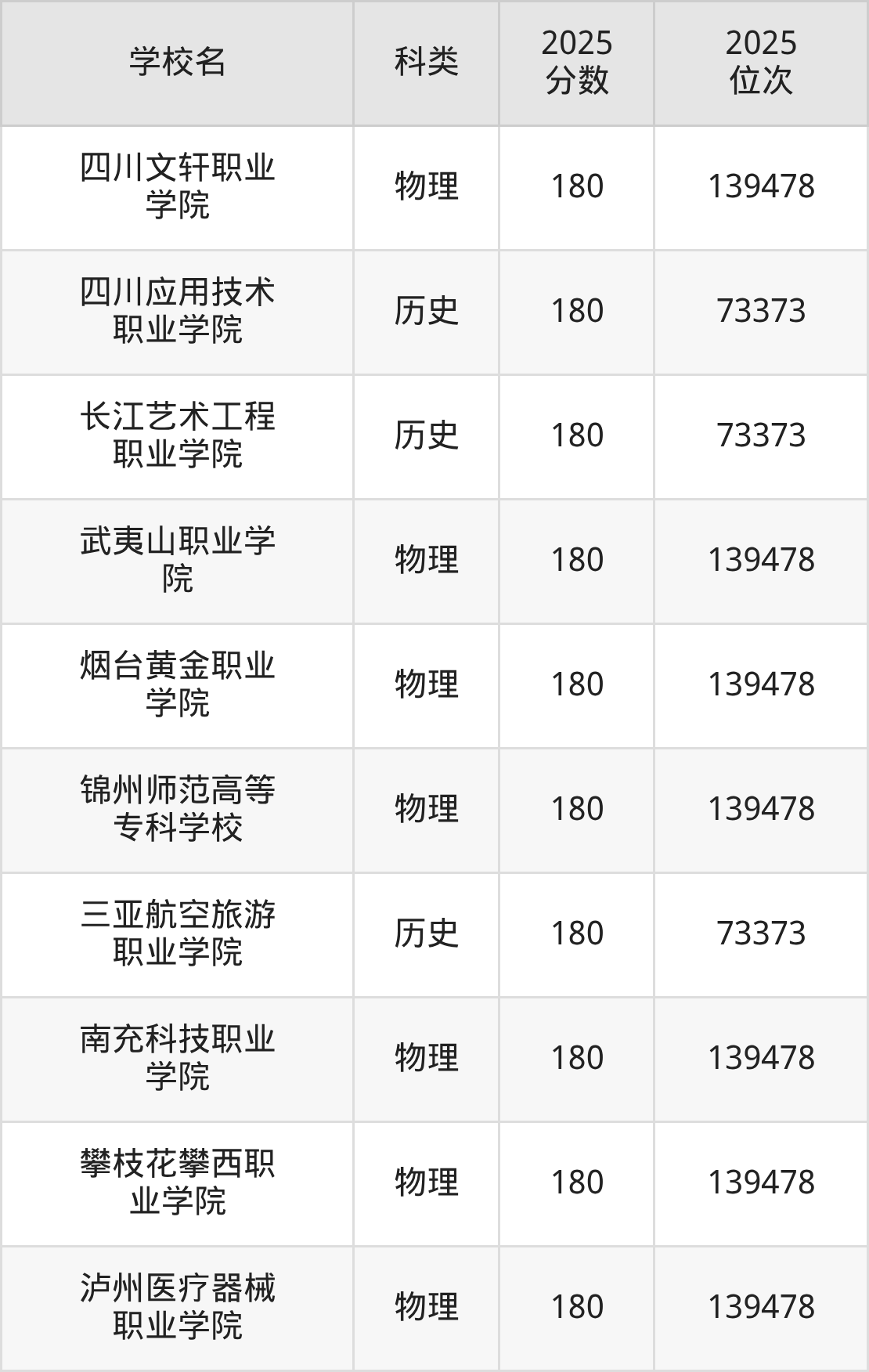 而位次最低的民办院校有辽宁广告职业学院、四川长江职业学院、四川国际标榜职业学院、南充电影工业职业学院,分数为180分,对应最低位次排名为73373名。