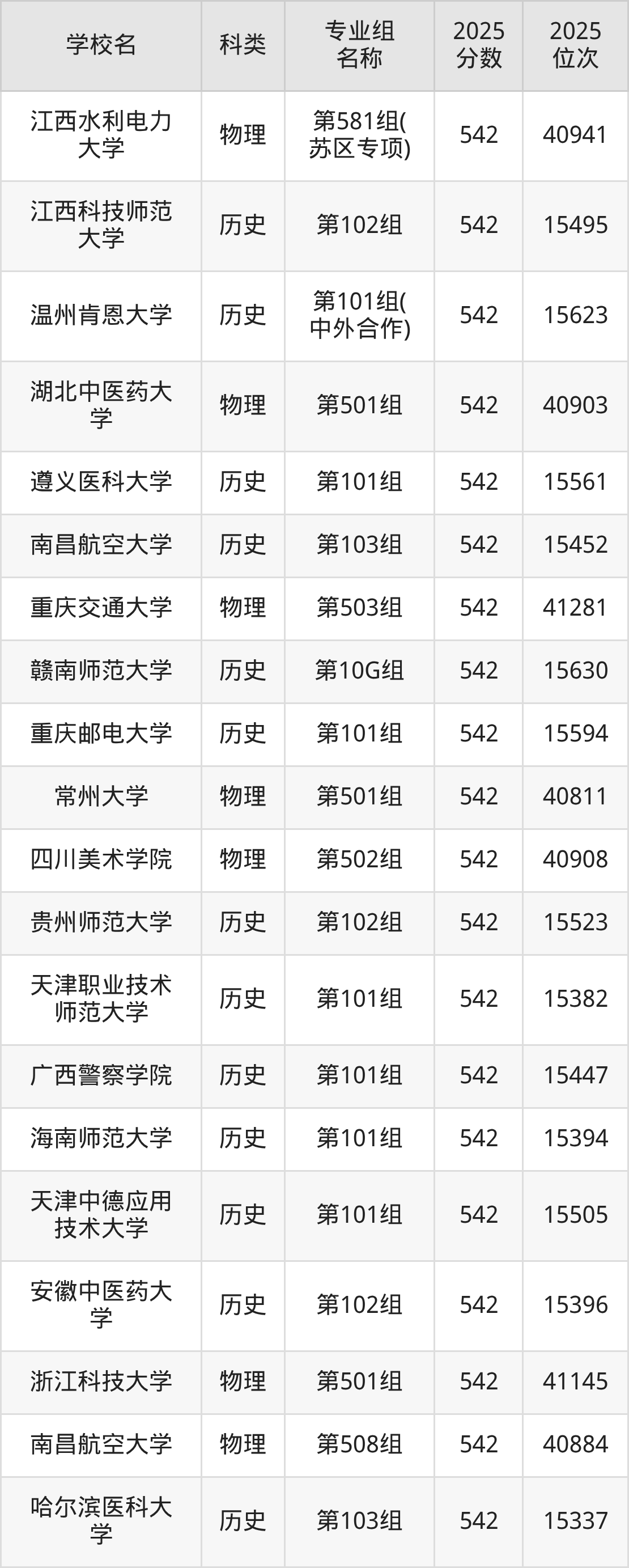 2025年江西历史类本科线为486分,542分能上的本科大学共计614所,其中公办大学录取位次排名最低的是桂林旅游学院(第101组(中外合作)486分,位次47572名),即代表考生省排名位次在47572名及以内就可以报考公办本科。