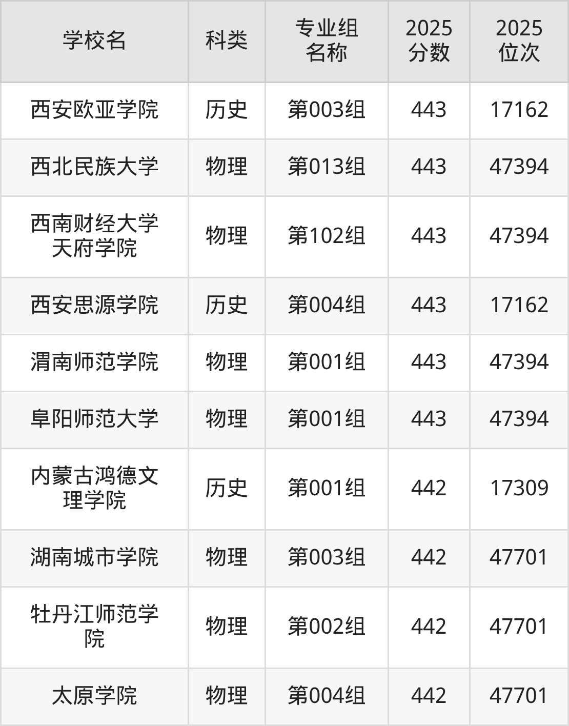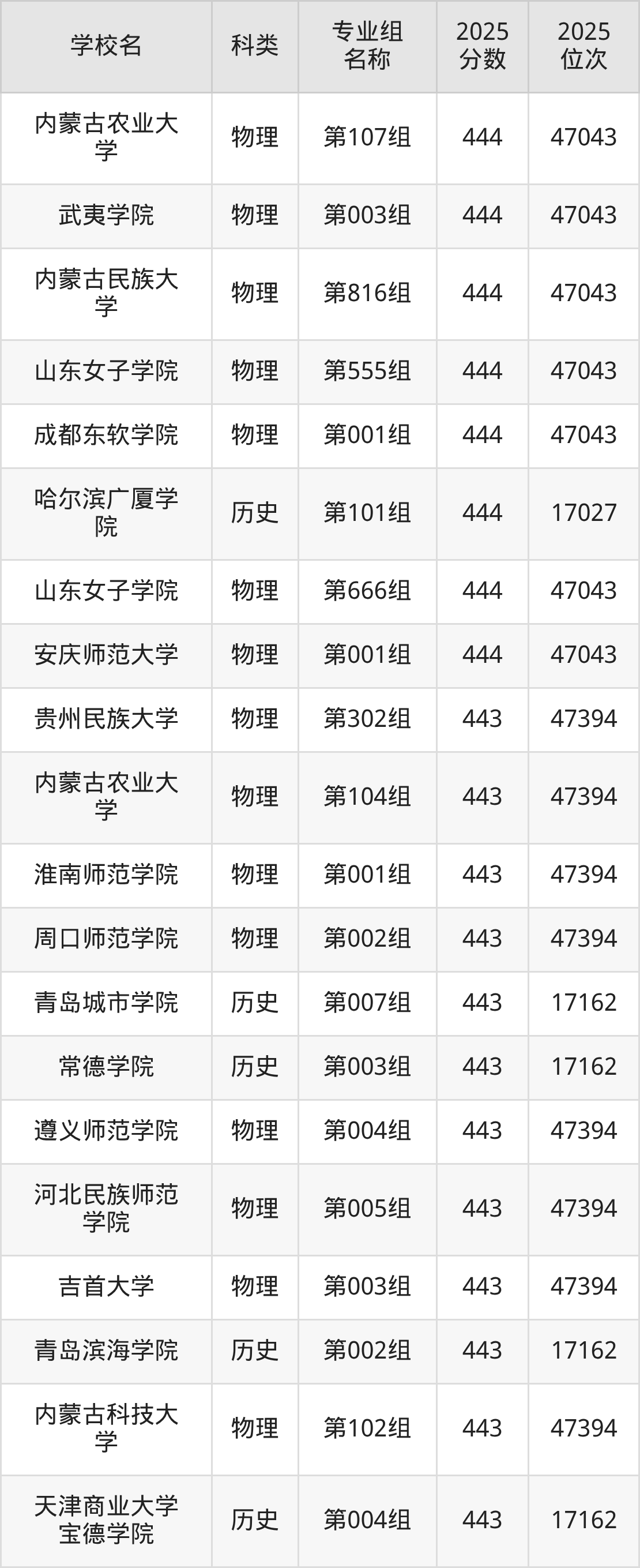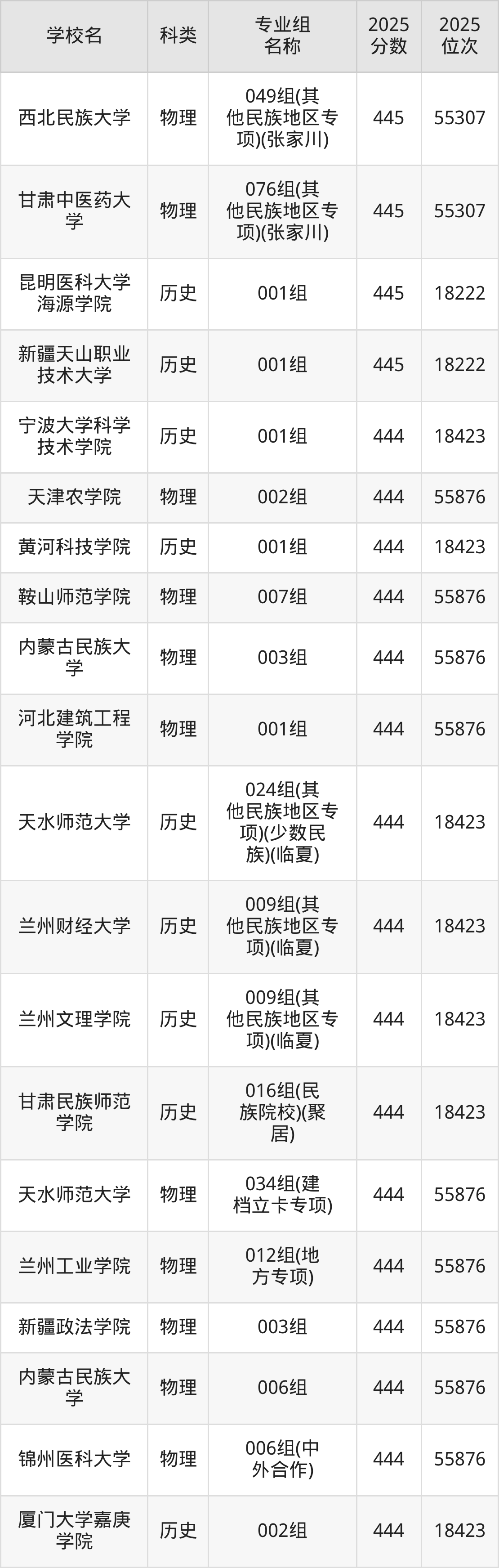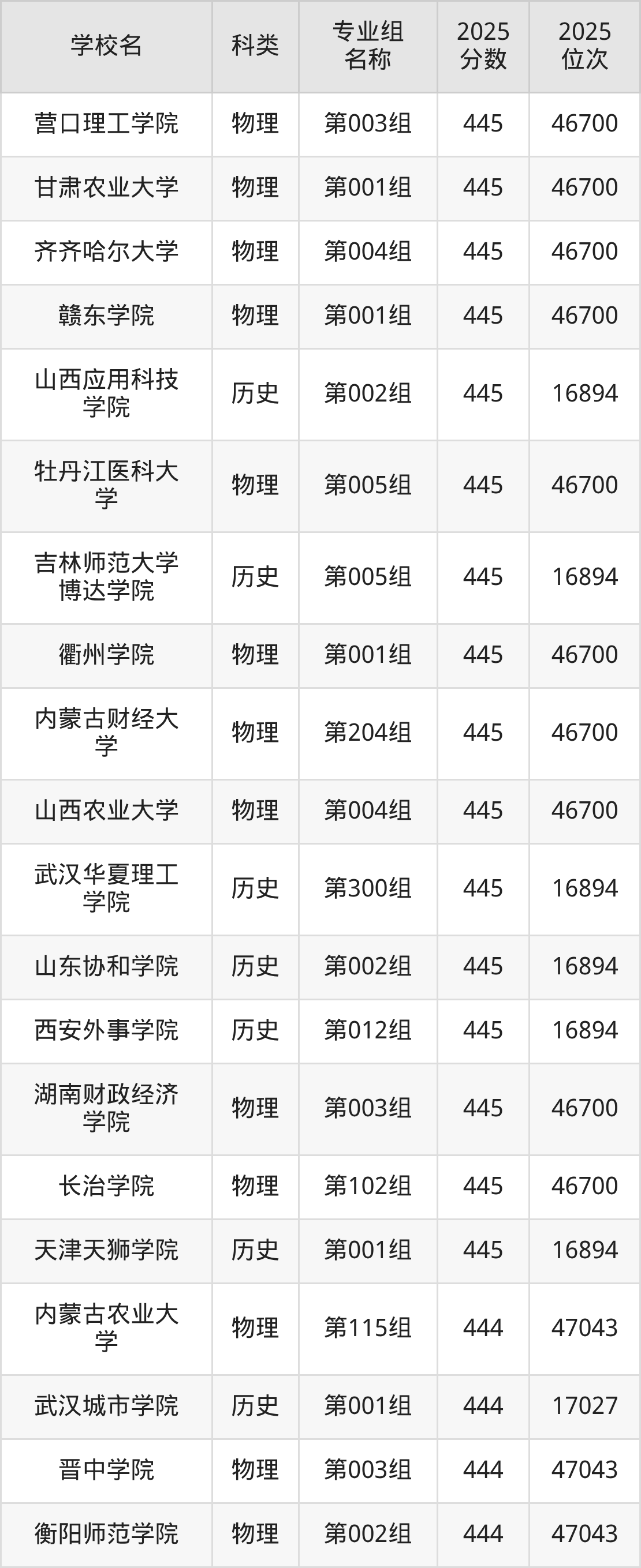 除上述院校外,445分可上的公办本科大学还有牡丹江师范学院(002组434分,位次61414名)、河北北方学院(001组(民语类及对等培养)(少数民族)427分,位次22014名)。