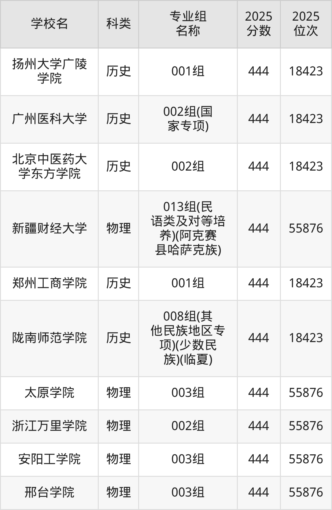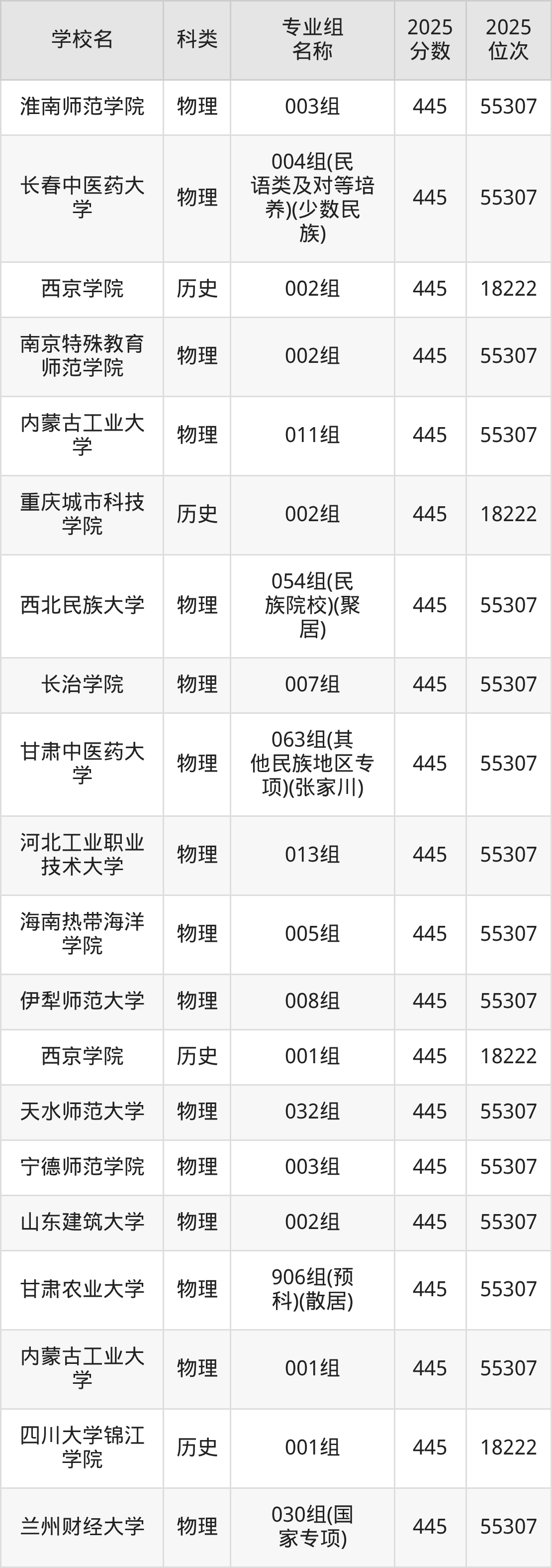 除上述院校外,445分可上的公办本科大学还有陇南师范学院(401组(其他民族地区专项)(积石山)403分,位次78952名)、甘肃林业职业技术大学(013组(其他民族地区专项)(临夏)396分,位次82744名)。