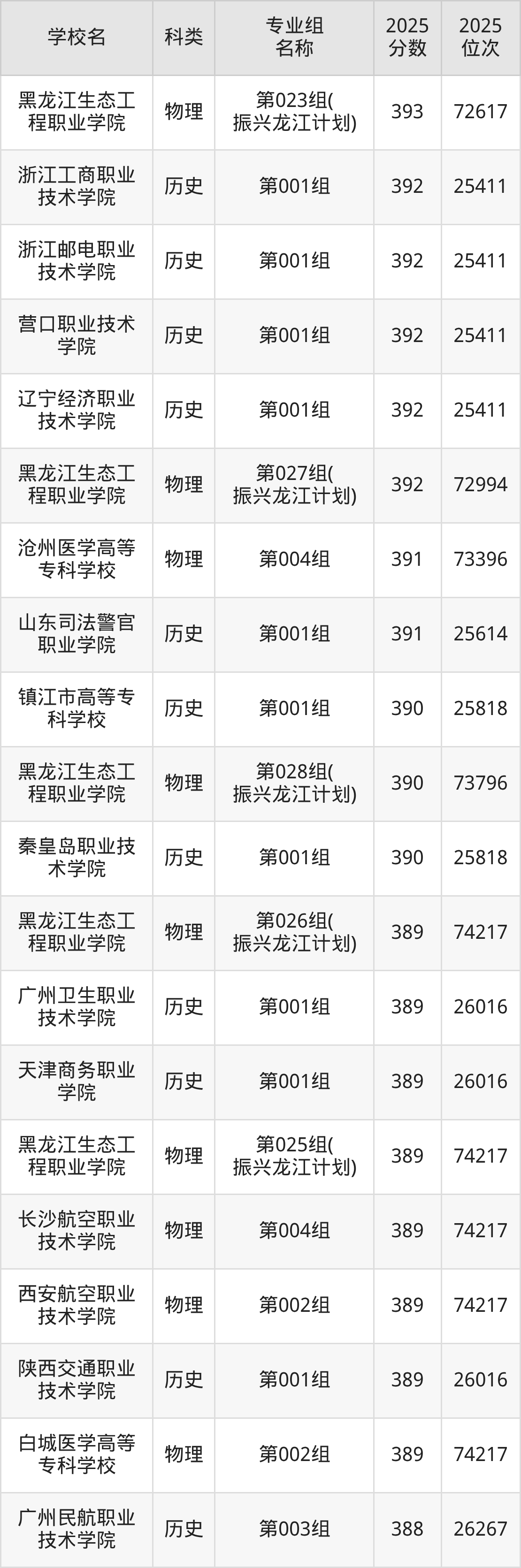 2025年黑龙江历史类专科线为160分,397分能上的专科学校共计375所,其中公办大学录取位次排名最低的是苏州百年职业学院(第001组(中外合作)178分,位次54414名),即代表考生省排名位次在54414名及以内就可以报考公办专科。
