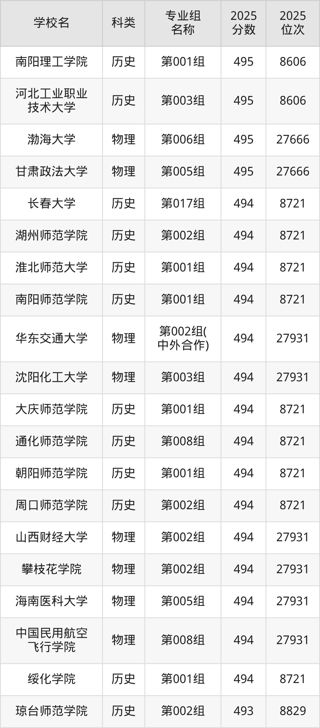 2025年吉林历史类本科线为384分,496分能上的二本大学共计258所,其中公办大学录取位次排名最低的是海南热带海洋学院(第002组(中外合作)384分),其2025最低位次为21618名。