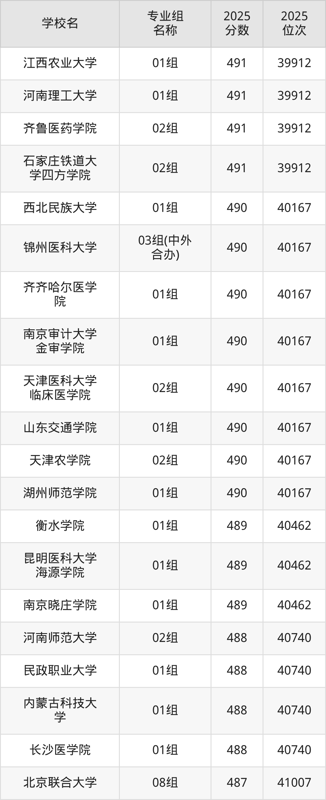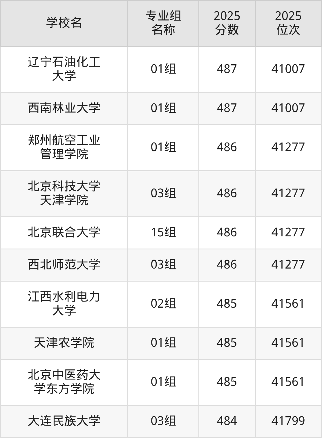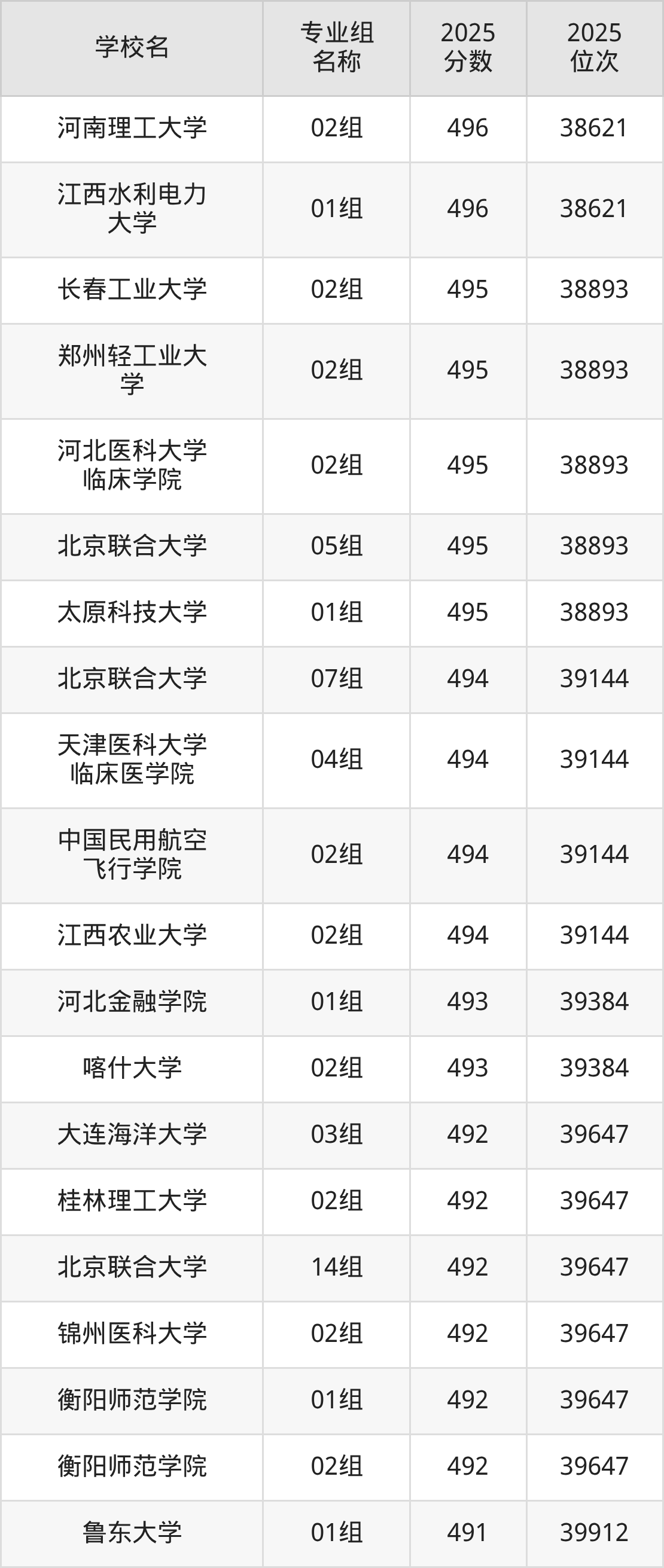除上述院校外,496分可上的公办二本大学还有江西水利电力大学(01组496分,位次38621名)、民政职业大学(02组480分,位次42782名)。