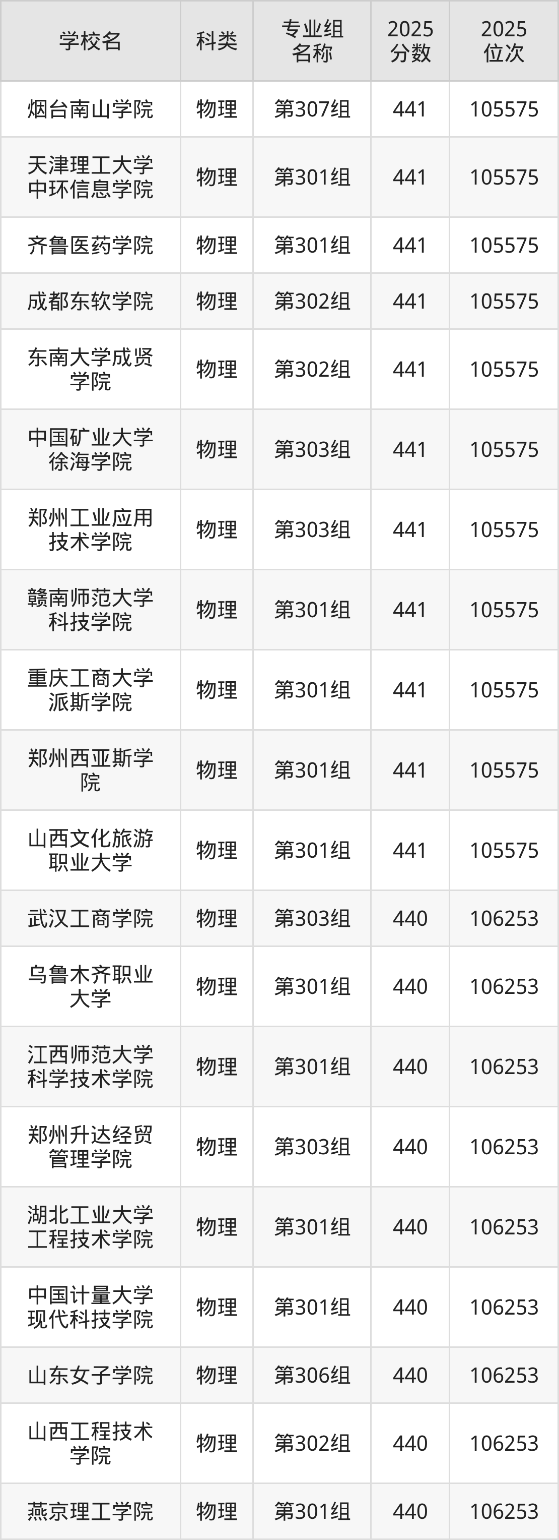 以山西物理类为例,441分能上的本科大学有武汉工商学院(位次排名106253名)、运城职业技术大学(位次排名110556名)、武汉学院(位次排名109853名)。