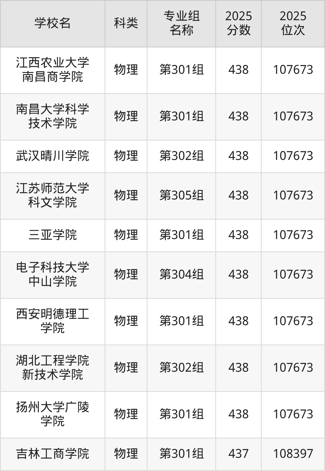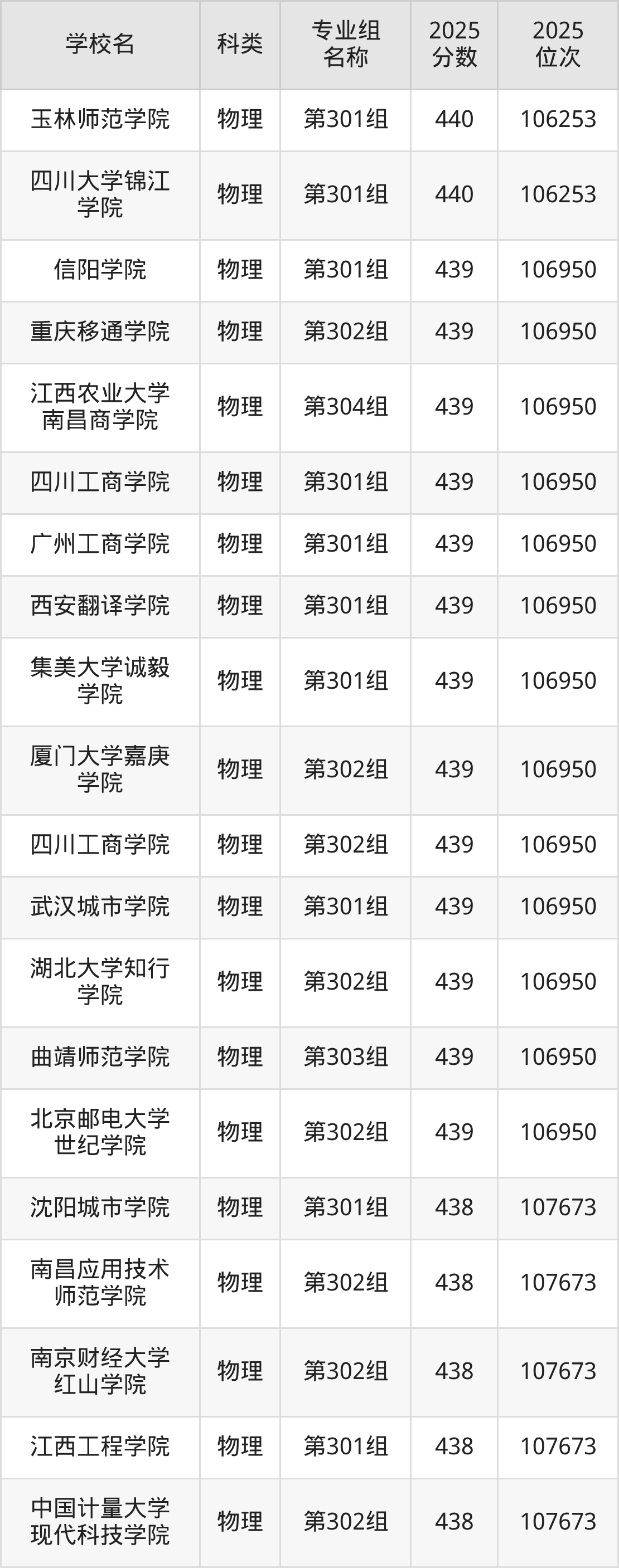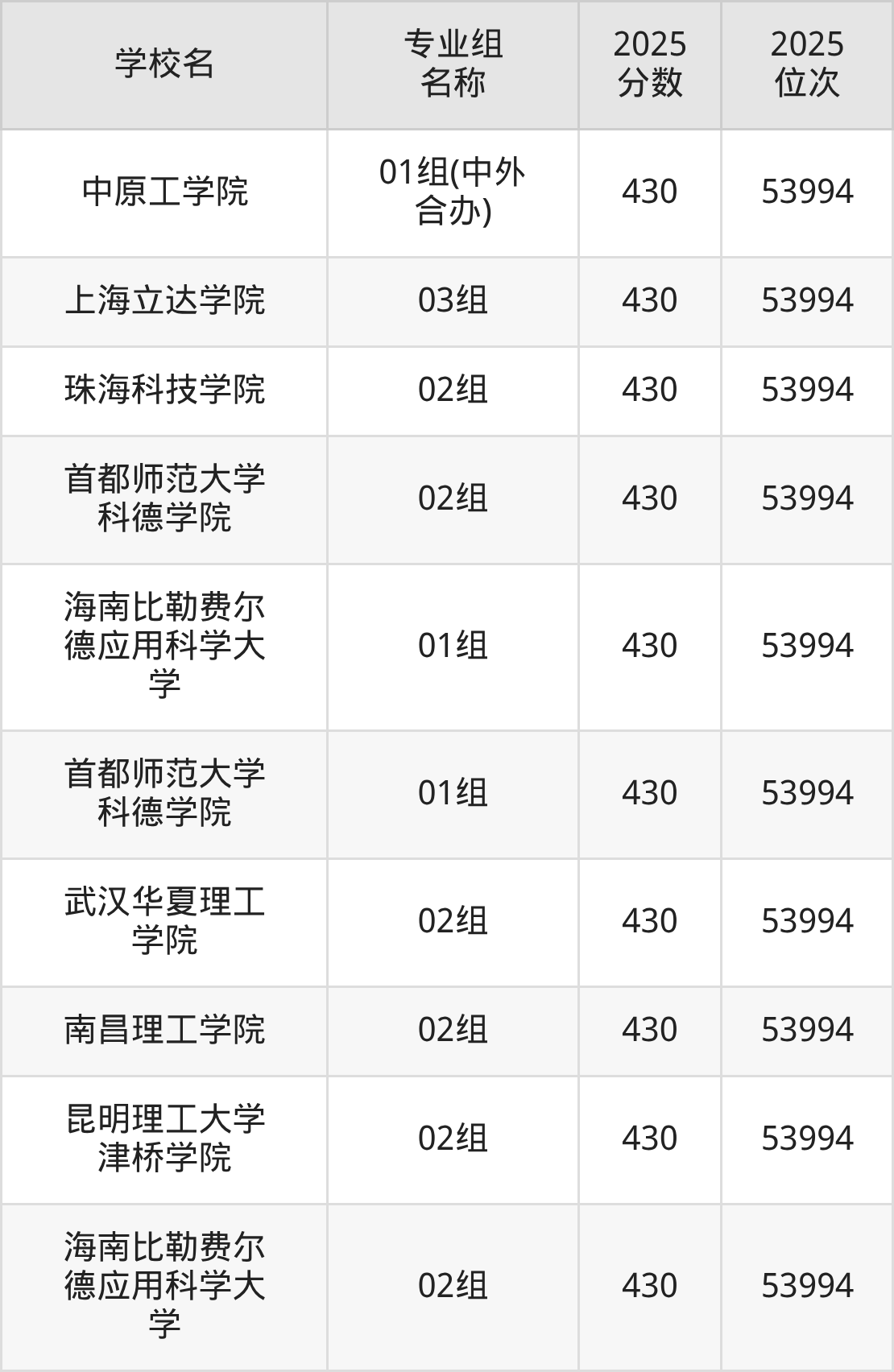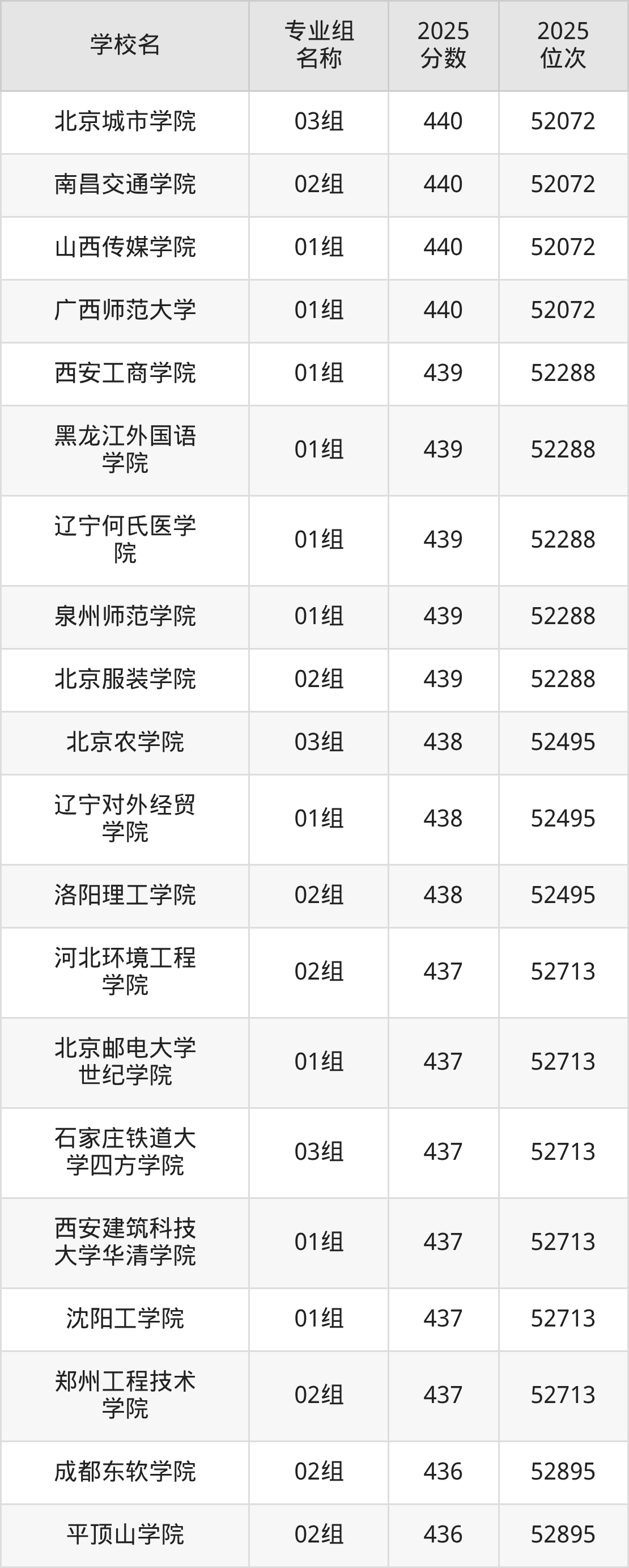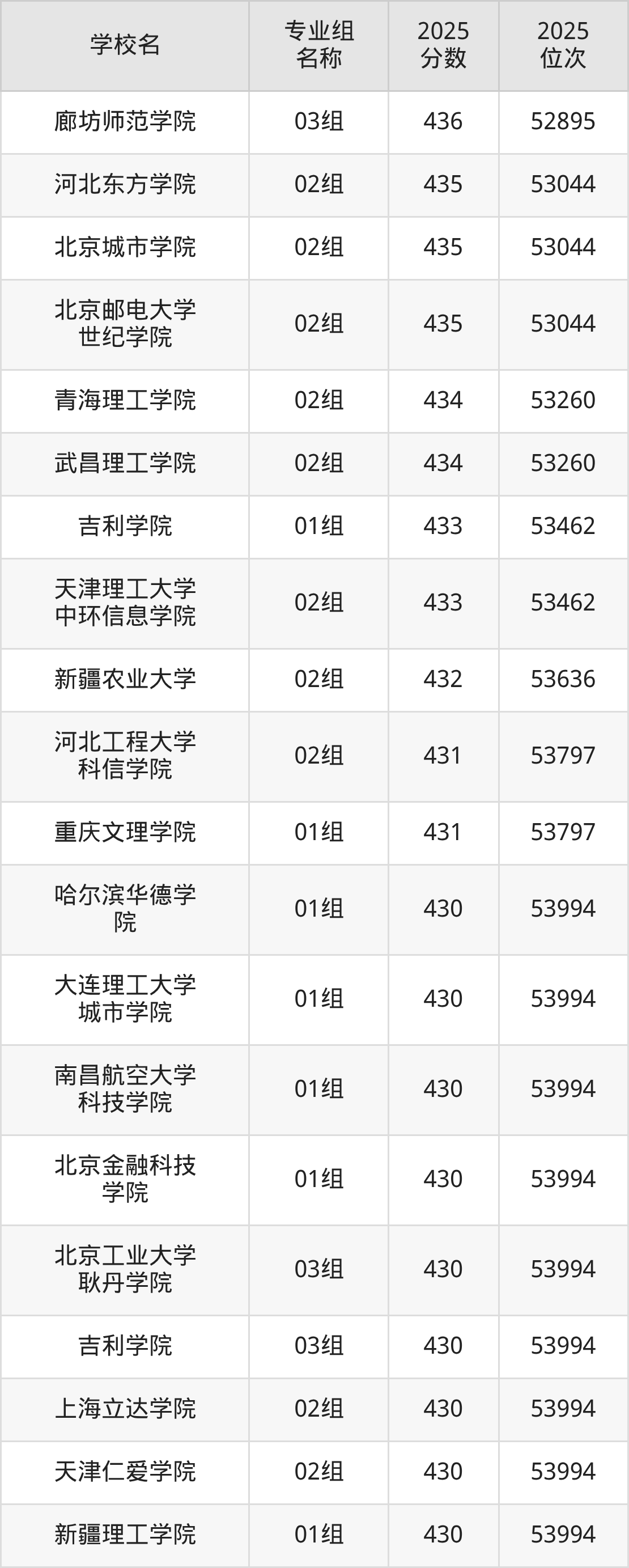 而位次最低的民办院校有西安思源学院(01组)、电子科技大学成都学院(02组)、华南农业大学珠江学院(01组)、北京工业大学耿丹学院(01组),分数为430分,对应最低位次排名为53994名。