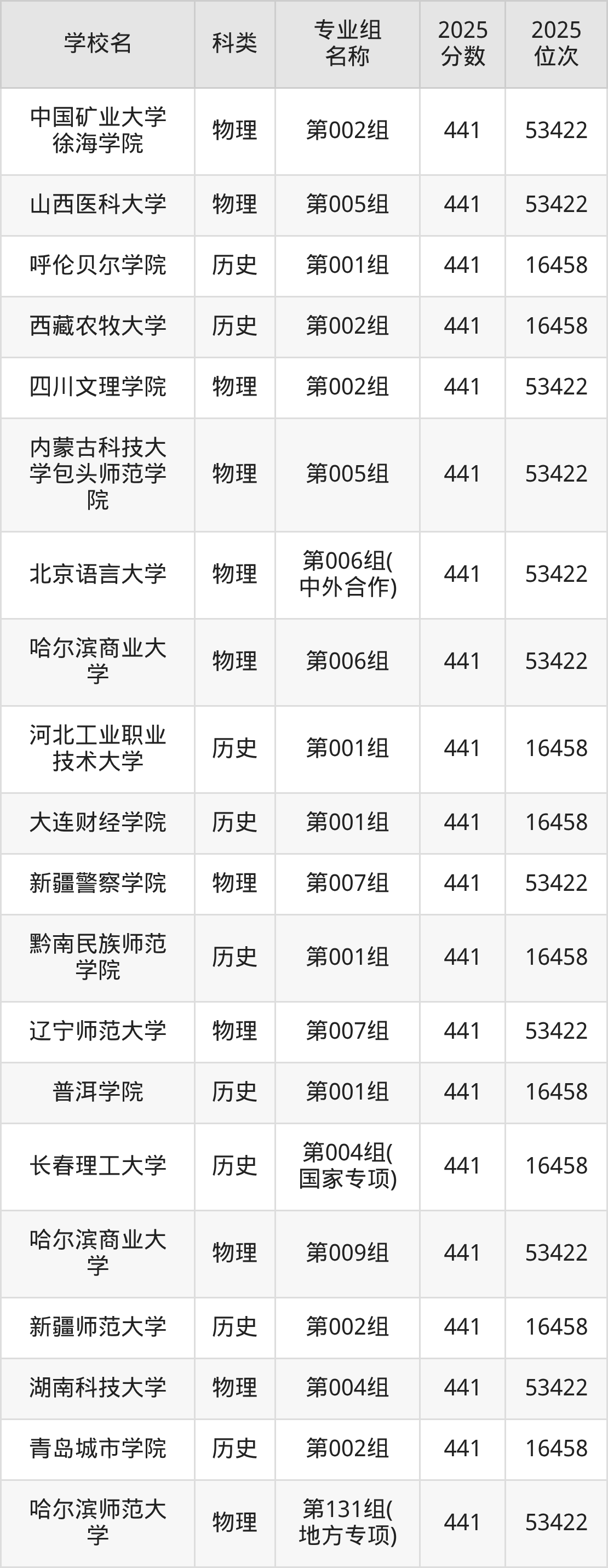 2025年黑龙江历史类本科线为405分,441分能上的本科大学共计231所,其中公办大学录取位次排名最低的是湖南科技大学(第001组405分,位次22977名),即代表考生省排名位次在22977名及以内就可以报考公办本科。
