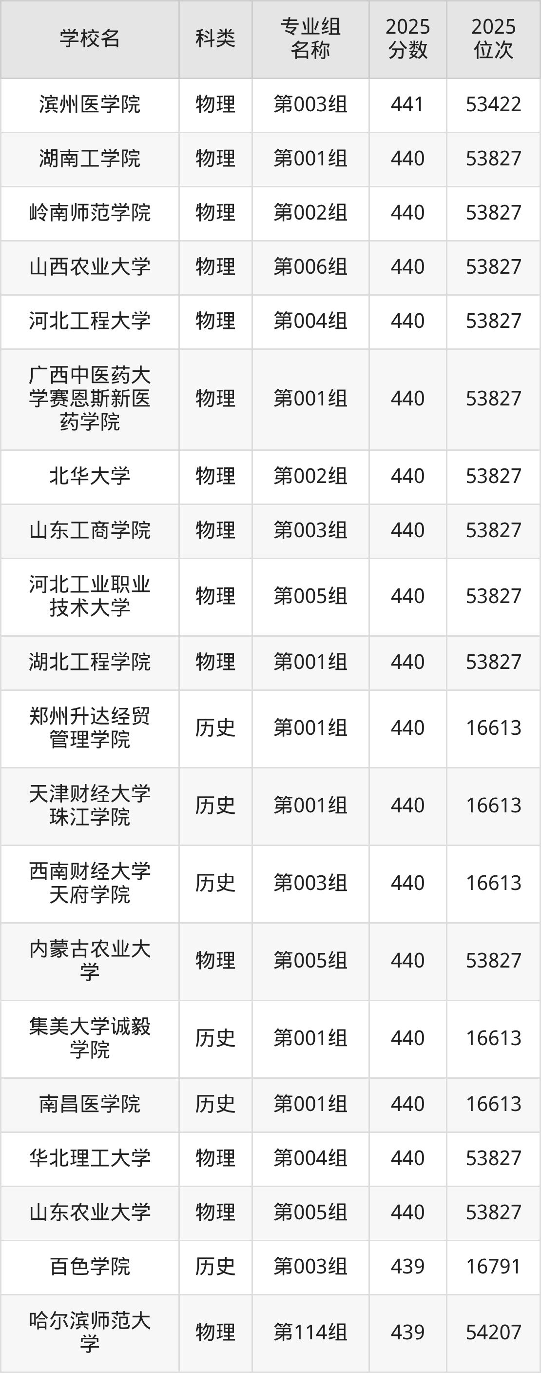 除上述院校外,441分可上的公办本科大学还有新疆工程学院(01组430分,位次53994名)、洛阳理工学院(02组438分,位次52495名)。