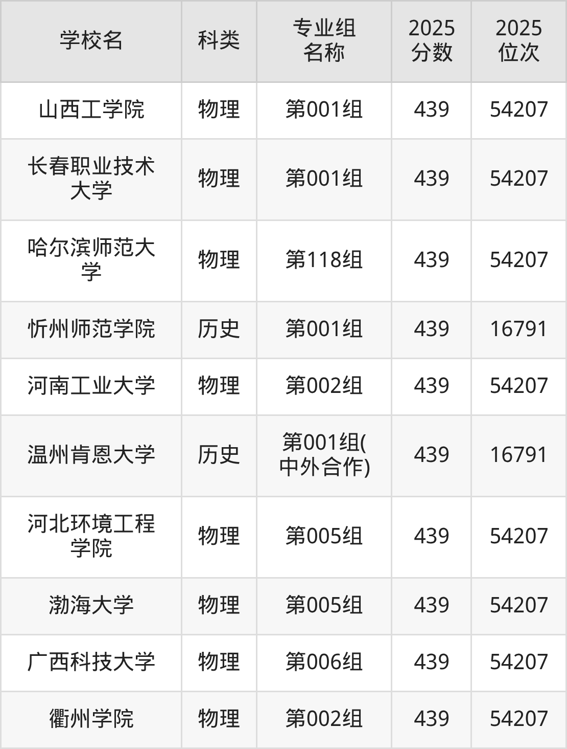 而民办大学录取位次排名最低的是山西应用科技学院(419分),其2025最低位次为120285名。