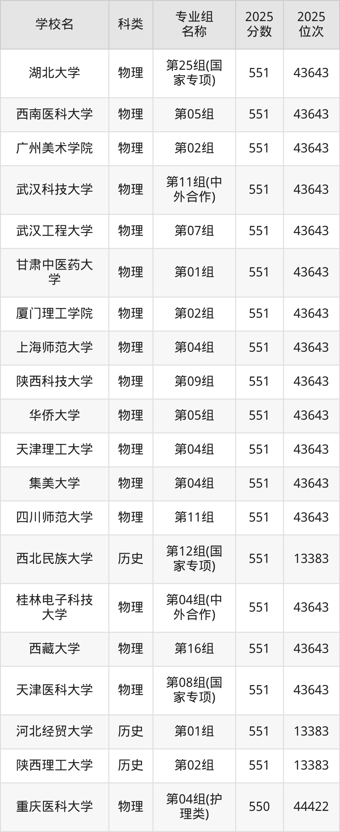 2025年湖北物理类本科线为426分,552分能上的本科大学共计845所,其中公办大学录取位次排名最低的是广东医科大学(第02组429分),其2025最低位次为146428名。