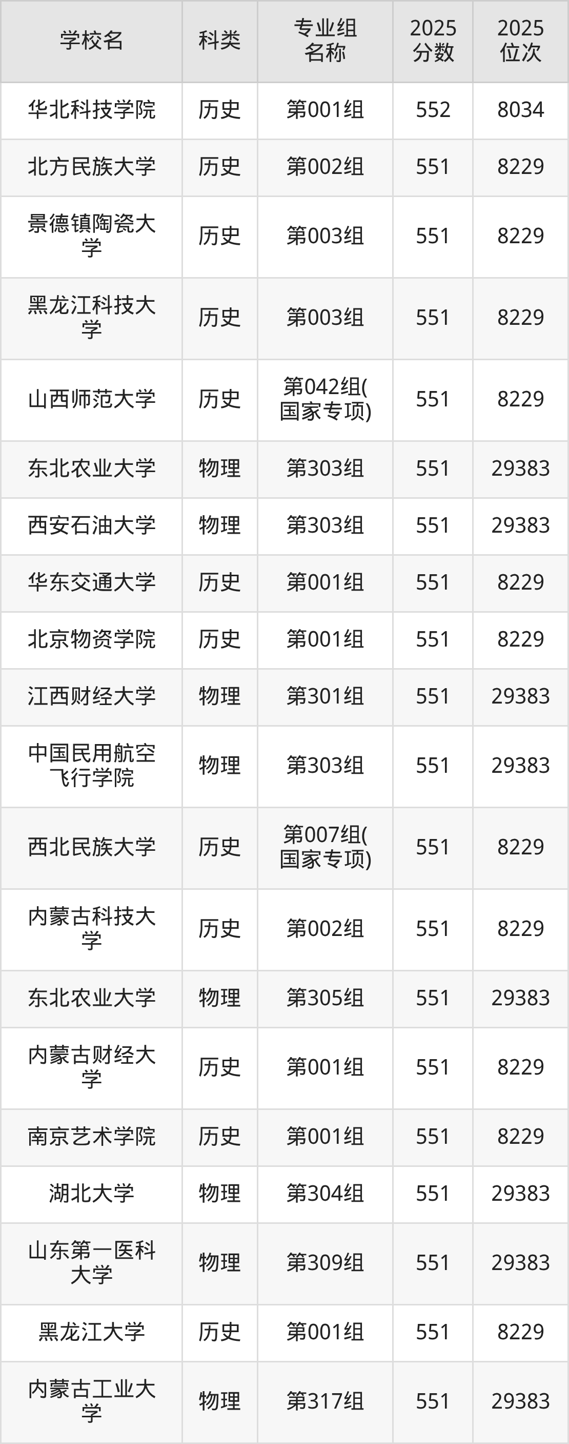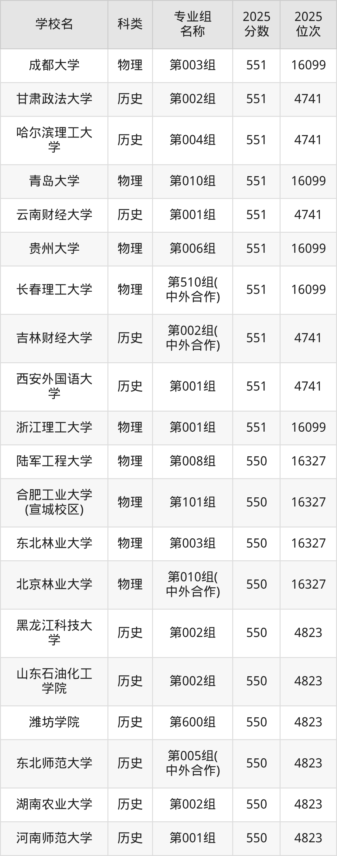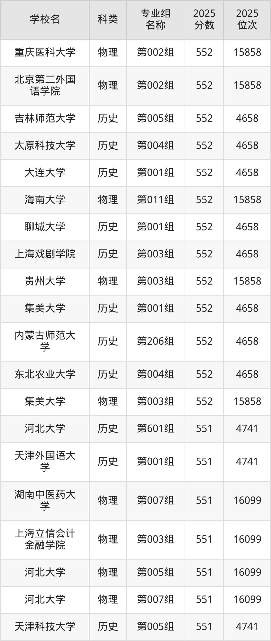 除上述院校外,552分可上的公办本科大学还有西藏农牧大学(第301组456分,位次94417名)、沈阳医学院(第303组504分,位次57634名)。