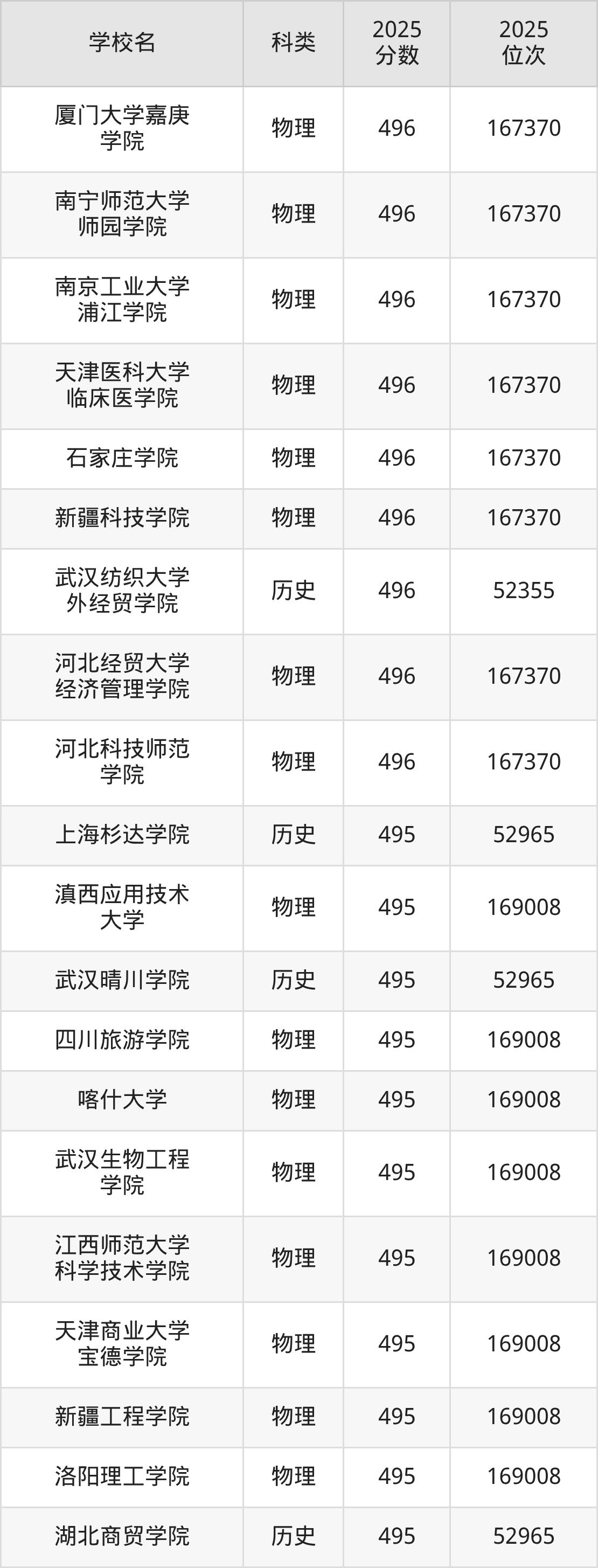 2025年河北物理类本科线为459分,496分能上的本科大学共计336所,其中公办大学录取位次排名最低的是邯郸学院(461分,位次221488名),即代表考生省排名位次在221488名及以内就可以报考公办本科。