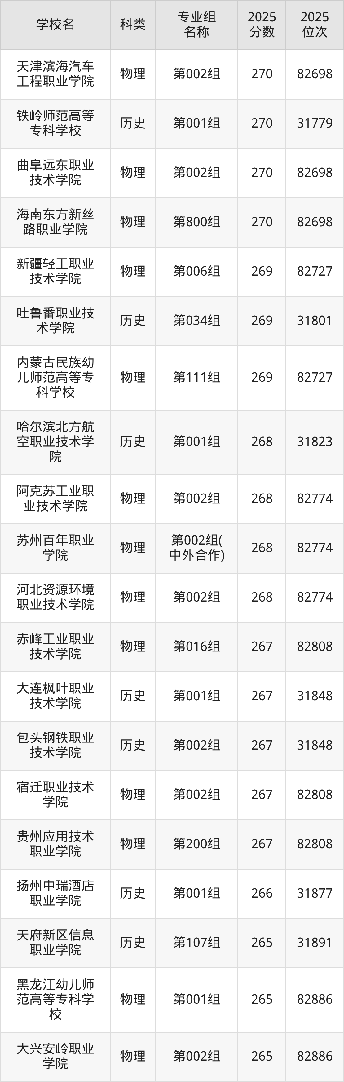 除上述院校外,270分可上的公办专科学校还有克孜勒苏职业技术学院(第001组206分,位次83696名)、乌兰察布职业学院(第002组190分)。