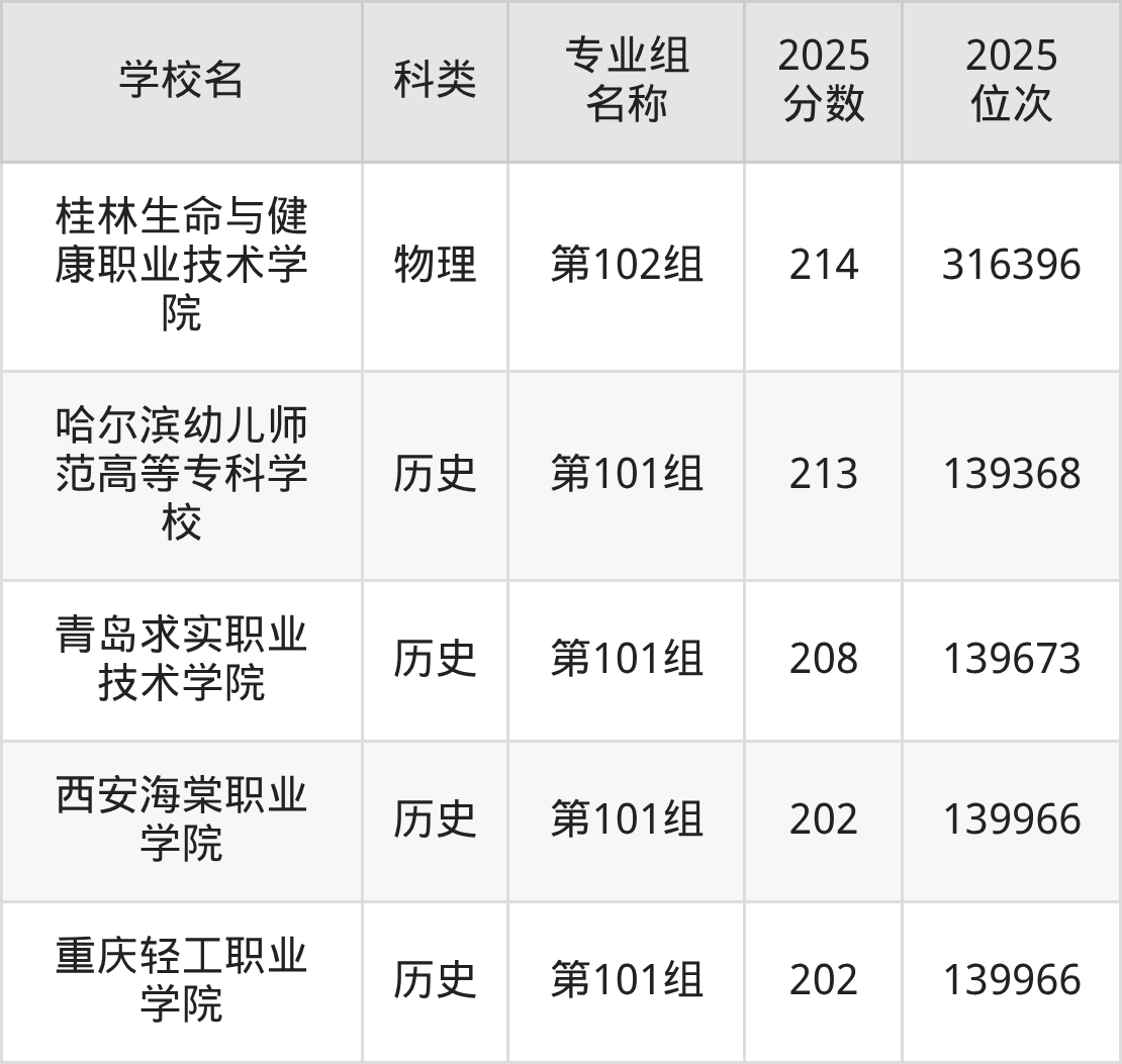 2025年湖南历史类专科线为200分,245分能上的专科学校共计16所,其中公办大学录取位次排名最低的是哈尔滨幼儿师范高等专科学校(第101组213分),其2025最低位次为139368名。