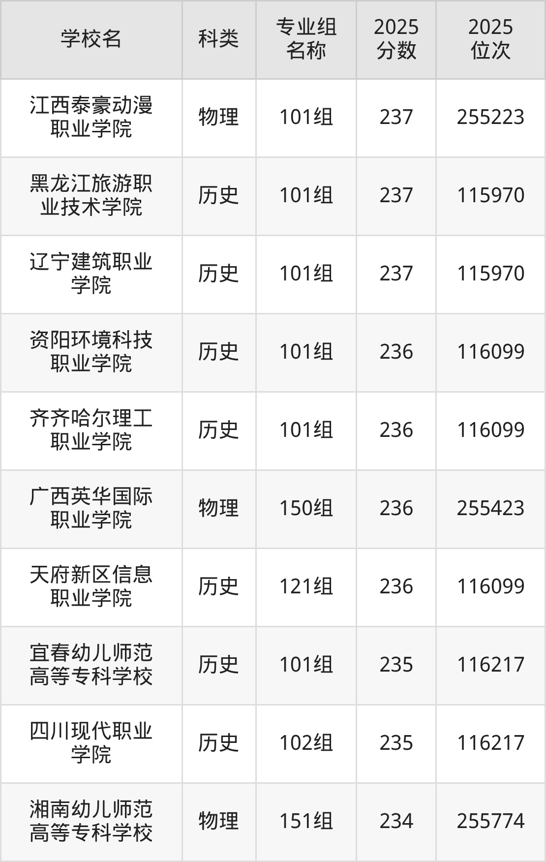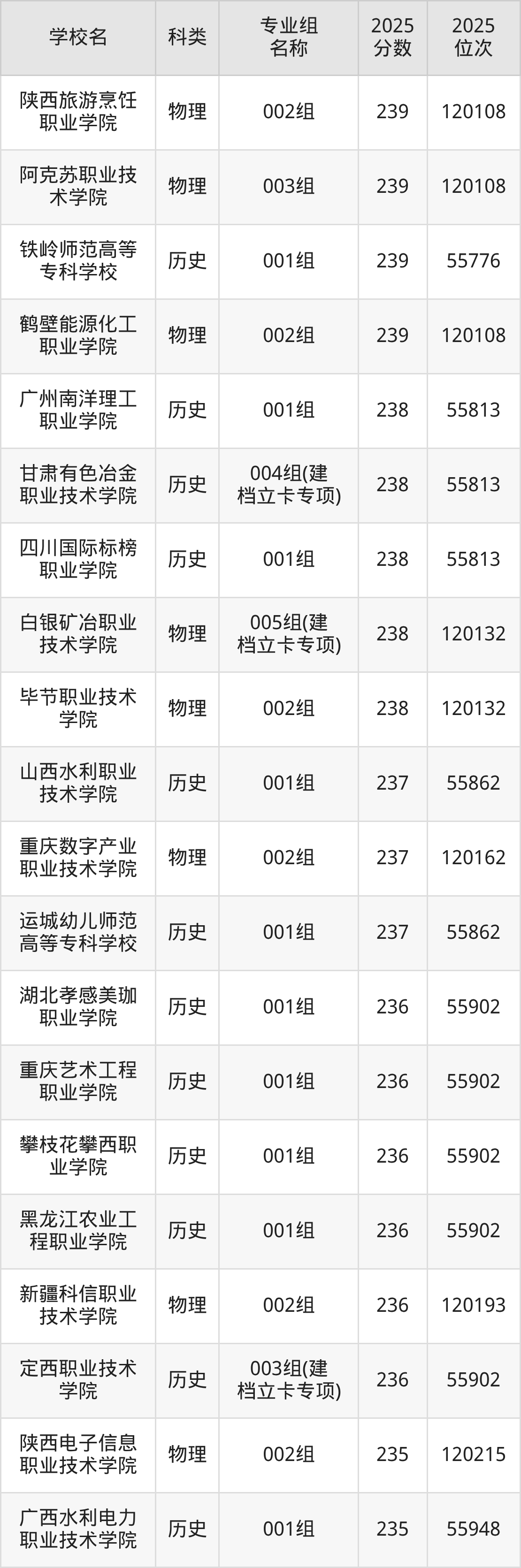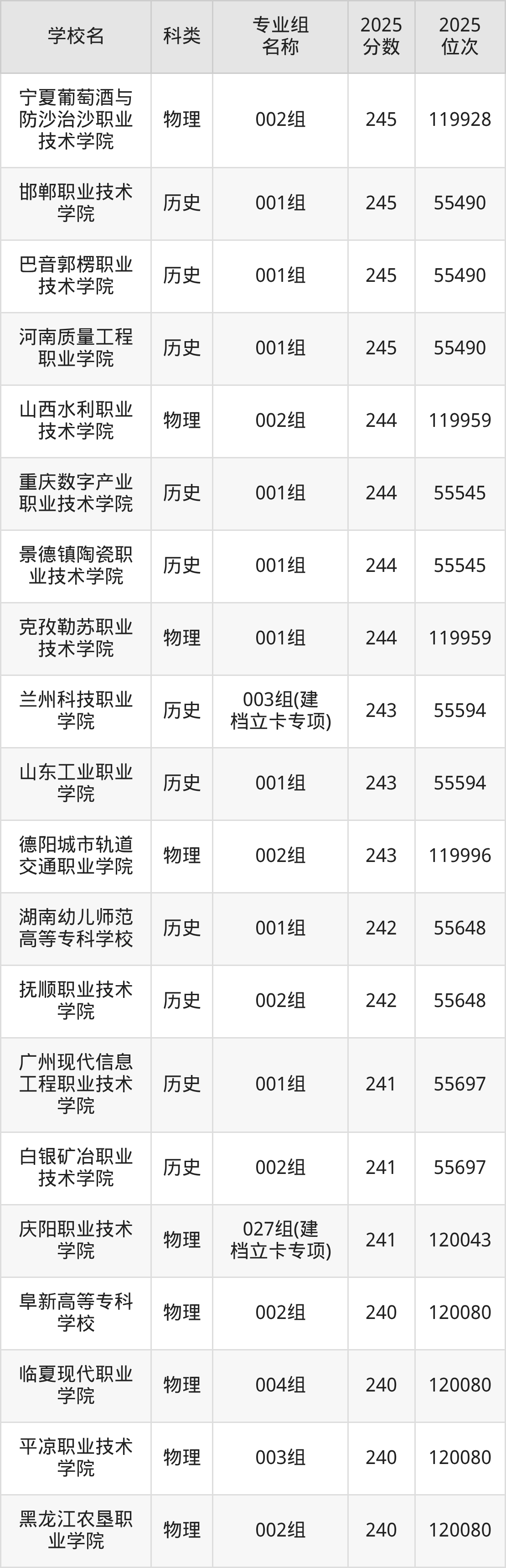2025年甘肃物理类专科线为180分,245分能上的专科学校共计108所,其中公办大学录取位次排名最低的是庆阳职业技术学院(030组(建档立卡专项)180分,位次120677名),即代表考生省排名位次在120677名及以内就可以报考公办专科。