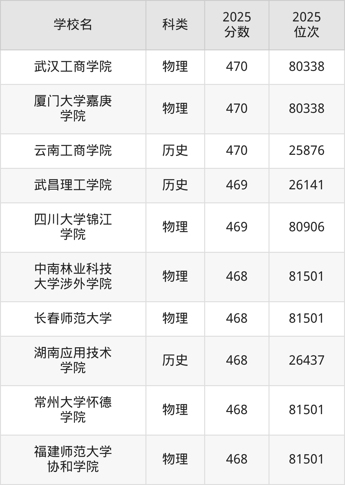 除上述院校外,476分可上的公办二本大学还有长春大学(455分,位次88620名)、防灾科技学院(465分,位次83220名)。