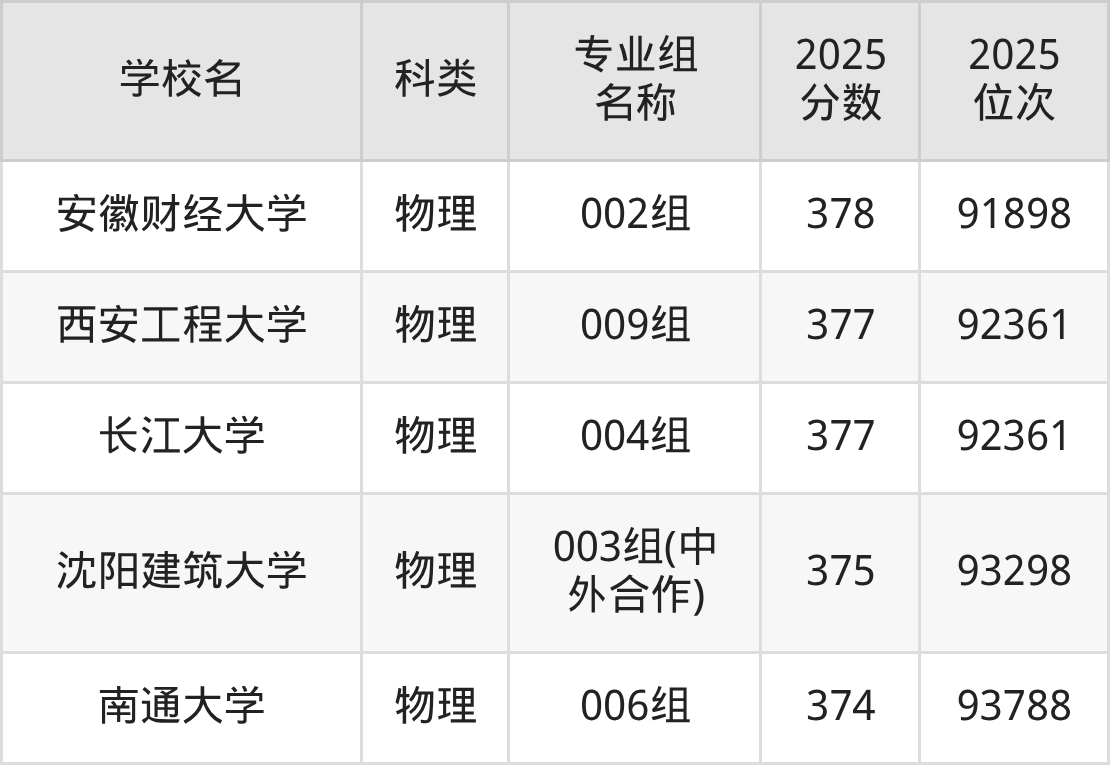 除上述院校外,380分可上的公办一本大学还有安徽财经大学(002组378分,位次91898名)、西安工程大学(009组377分,位次92361名)。