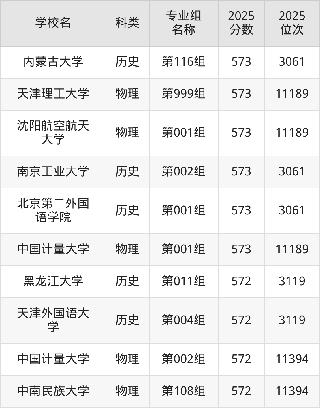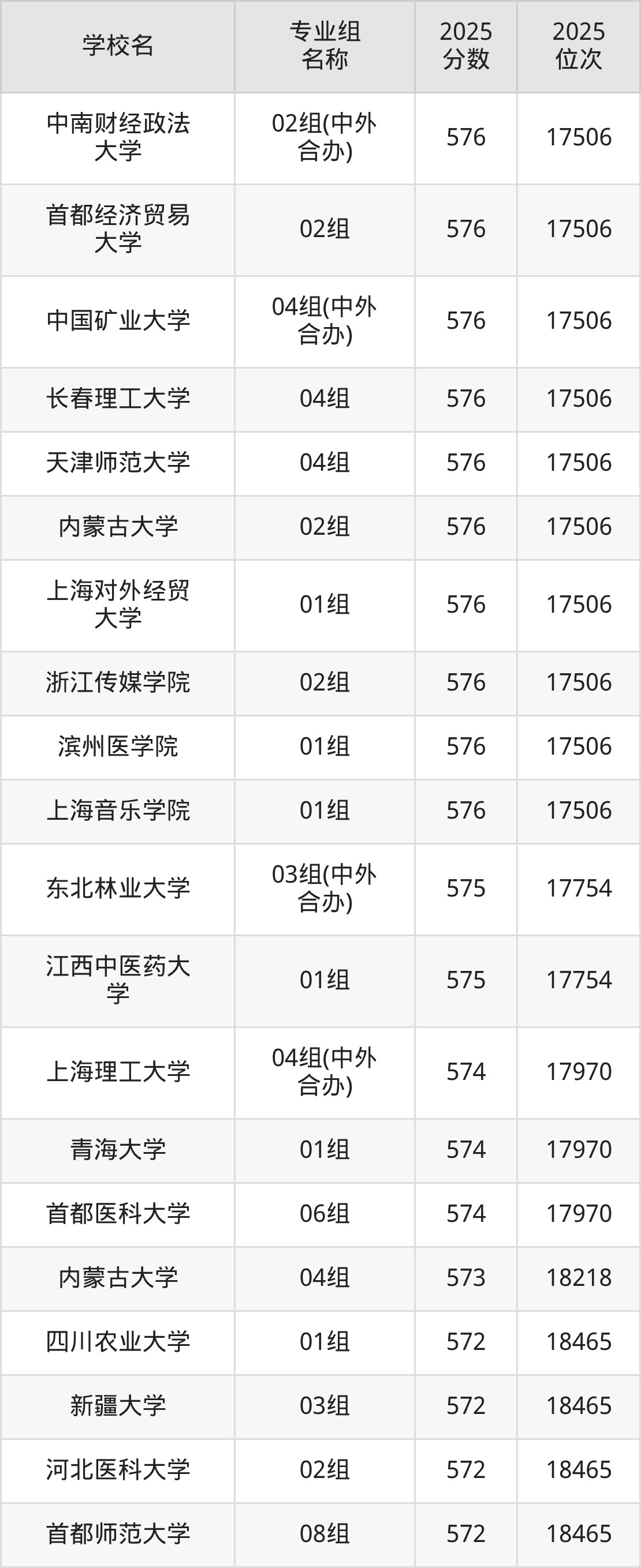 以内蒙古物理类为例,576分能上的本科大学有银川科技学院(位次排名61601名)、南昌医学院(位次排名21084名)、大连民族大学(位次排名27496名)。