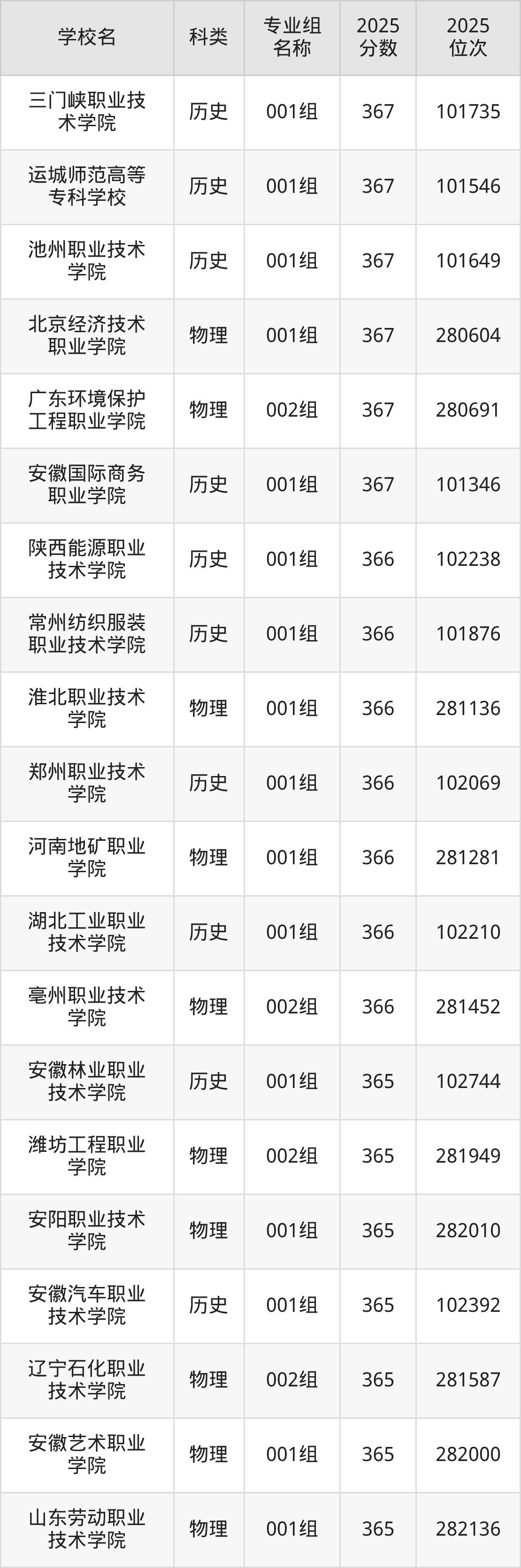 2025年安徽历史类专科线为200分,369分能上的专科学校共计515所,其中公办大学录取位次排名最低的是满洲里俄语职业学院(001组201分),其2025最低位次为141292名。