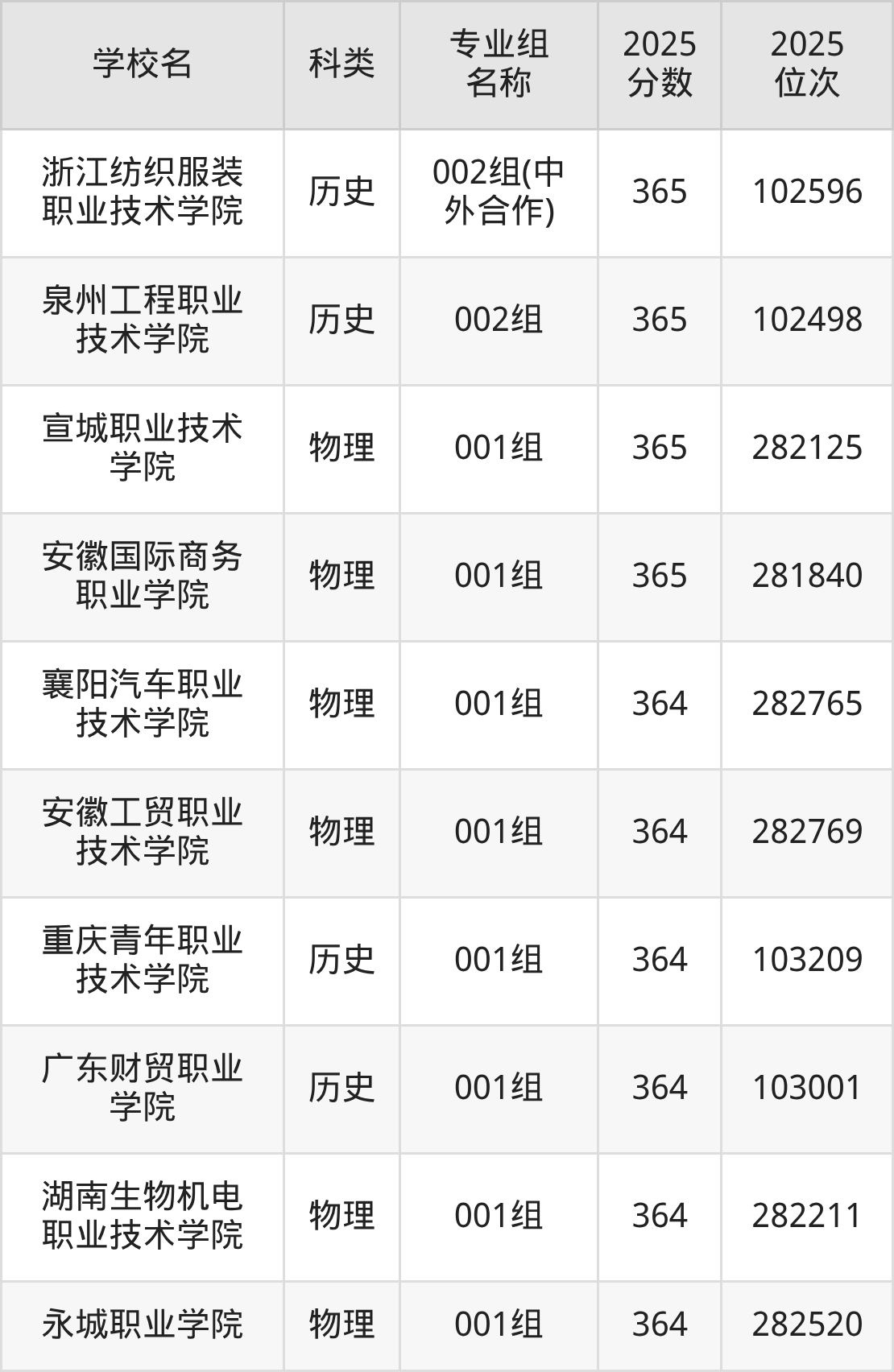 2025年安徽物理类专科线为200分,369分能上的专科学校共计417所,其中公办大学录取位次排名最低的是苏州百年职业学院(001组(中外合作)201分),其2025最低位次为320745名。
