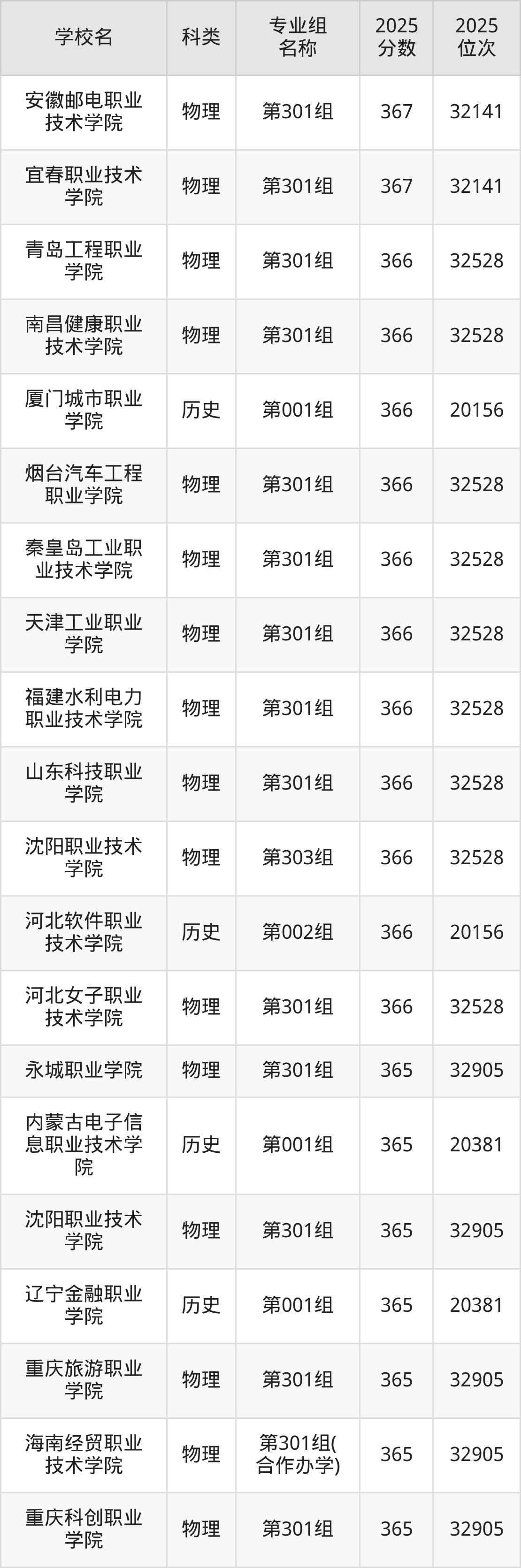 2025年山西物理类专科线为100分,369分能上的专科学校共计497所,其中公办大学录取位次排名最低的是长治职业技术学院(第304组104分,位次62332名),即代表考生省排名位次在62332名及以内就可以报考公办专科。