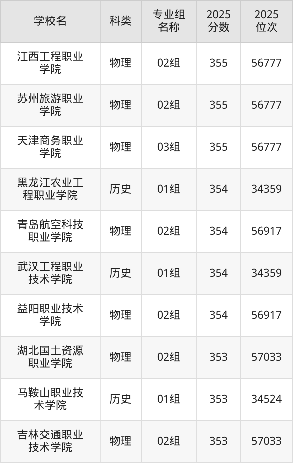 除上述院校外,369分可上的公办专科学校还有江苏农林职业技术学院(08组(中外合作)220分,位次66935名)、临汾职业技术学院(01组299分,位次41265名)。