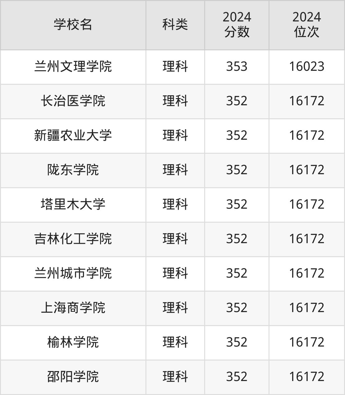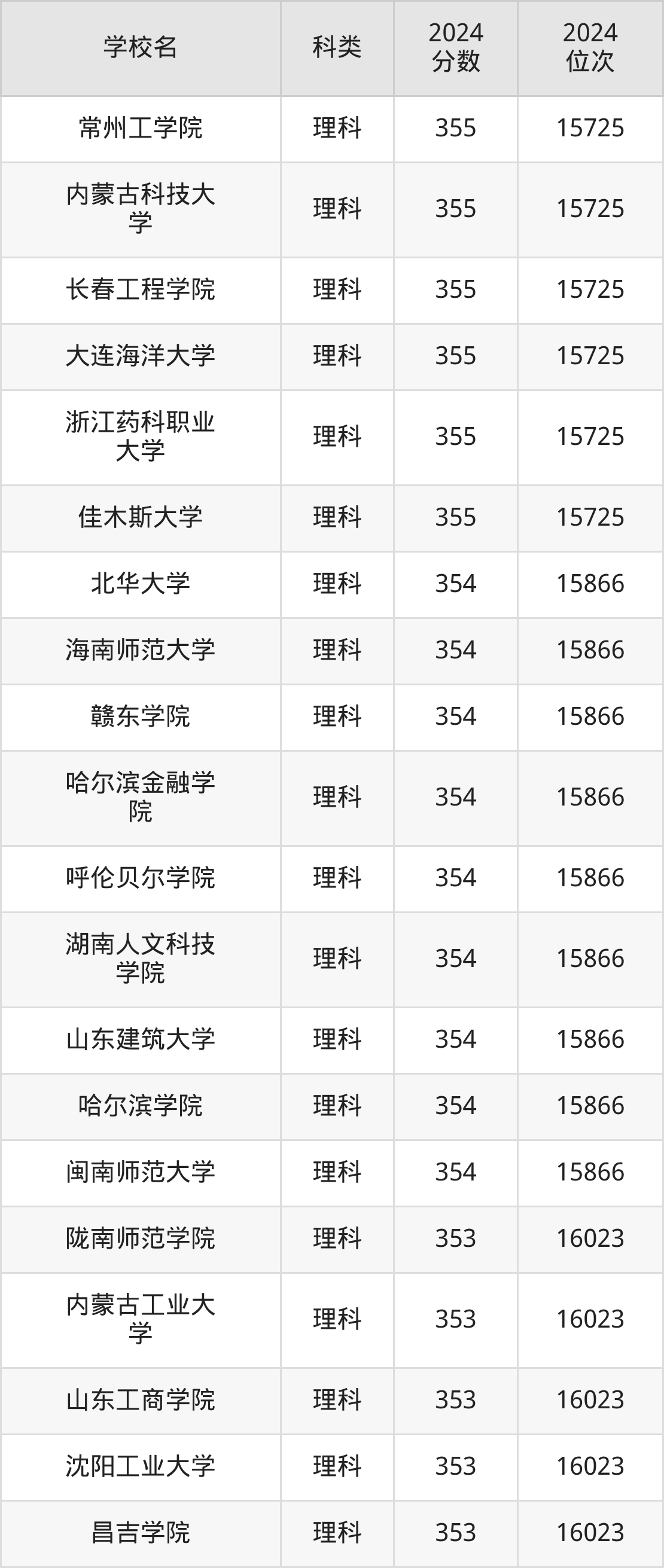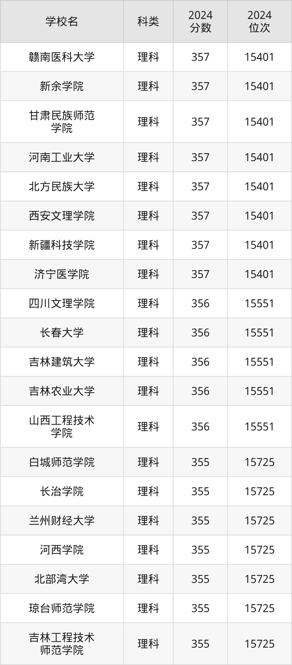 以青海理科为例,357分能上的一本大学有长春大学(位次排名15551名)、山东工商学院(位次排名16023名)、新疆和田学院(位次排名16623名)。