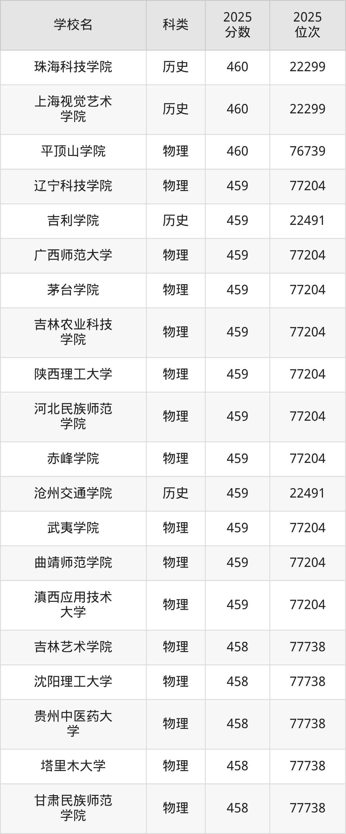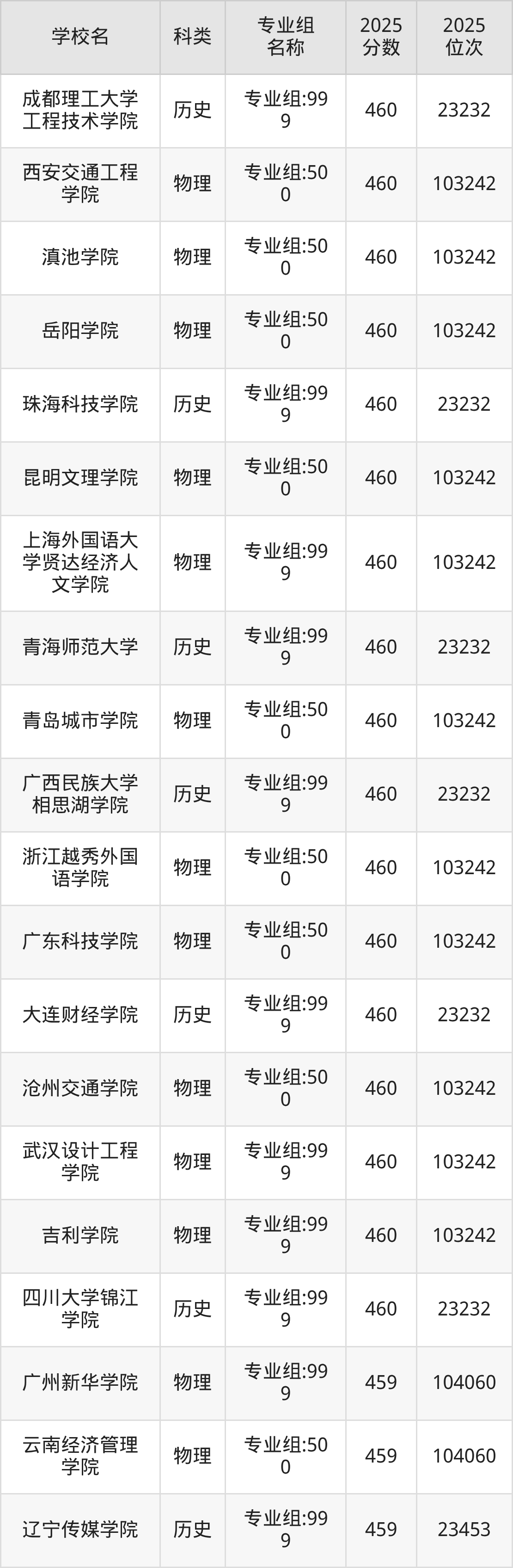 以辽宁物理类为例,460分能上的本科大学有南昌大学科学技术学院(位次排名84760名)、琼台师范学院(位次排名93435名)、西安建筑科技大学华清学院(位次排名99769名)。