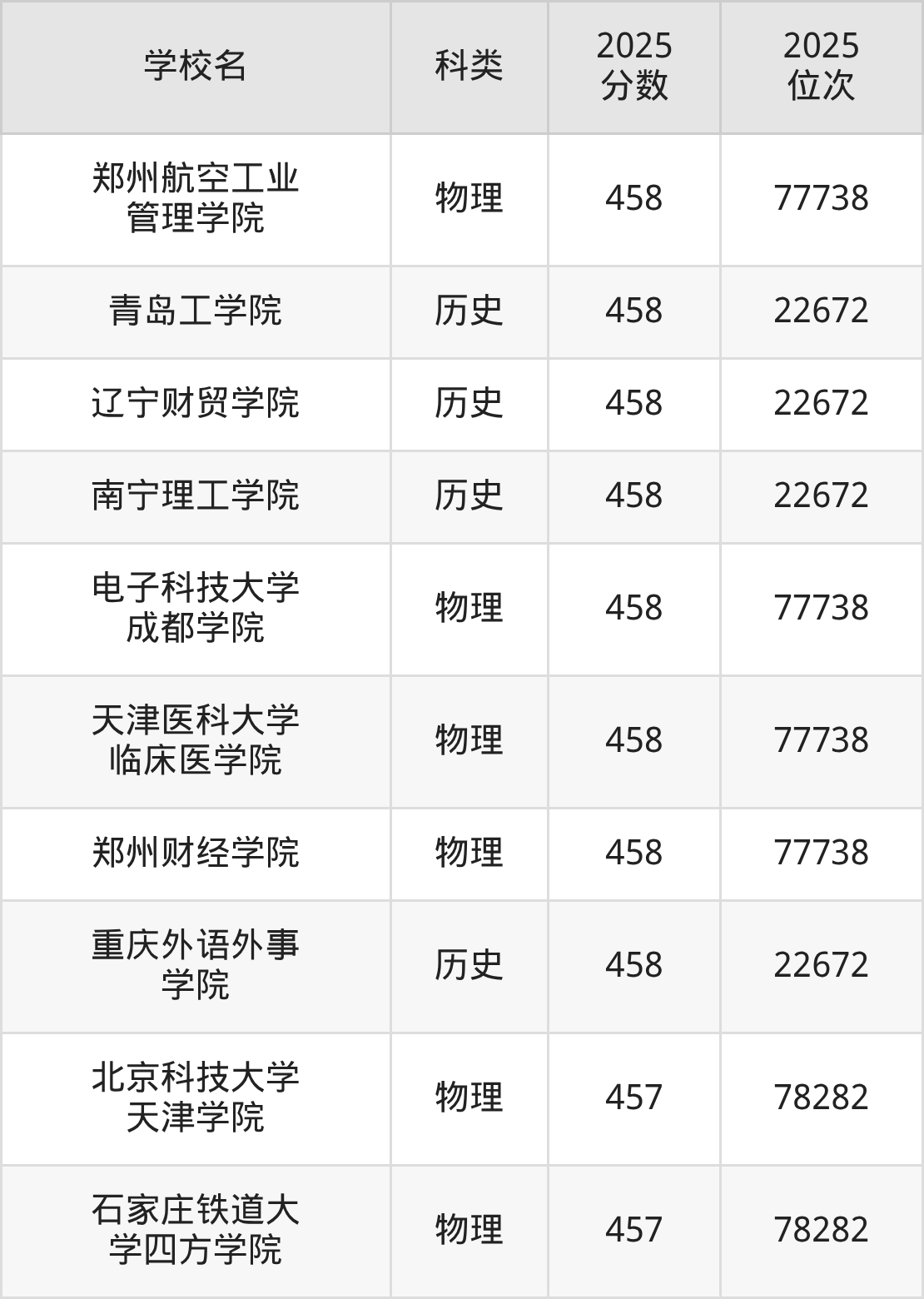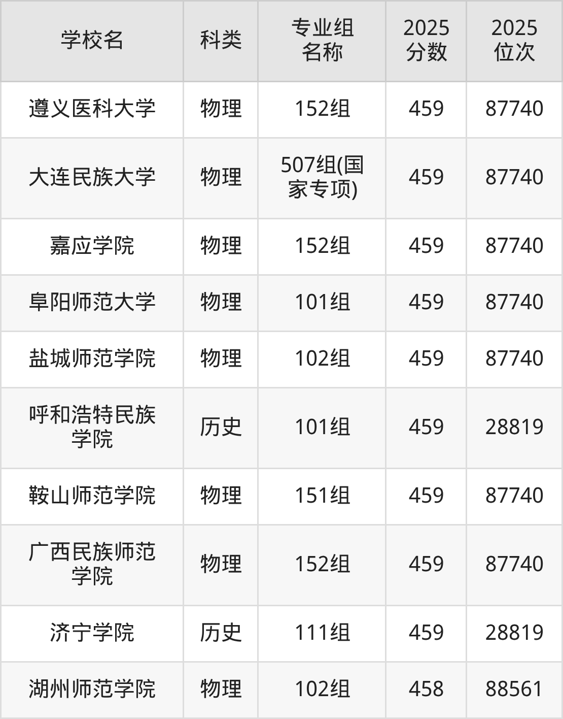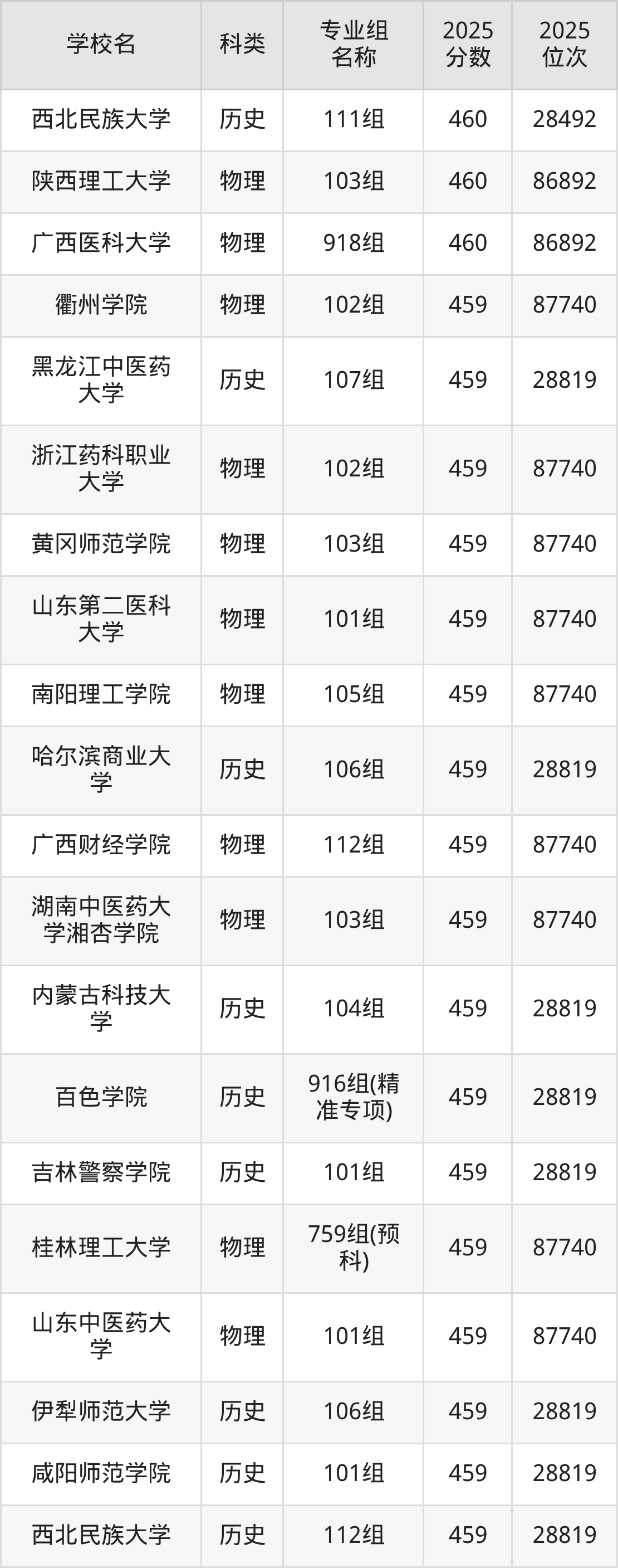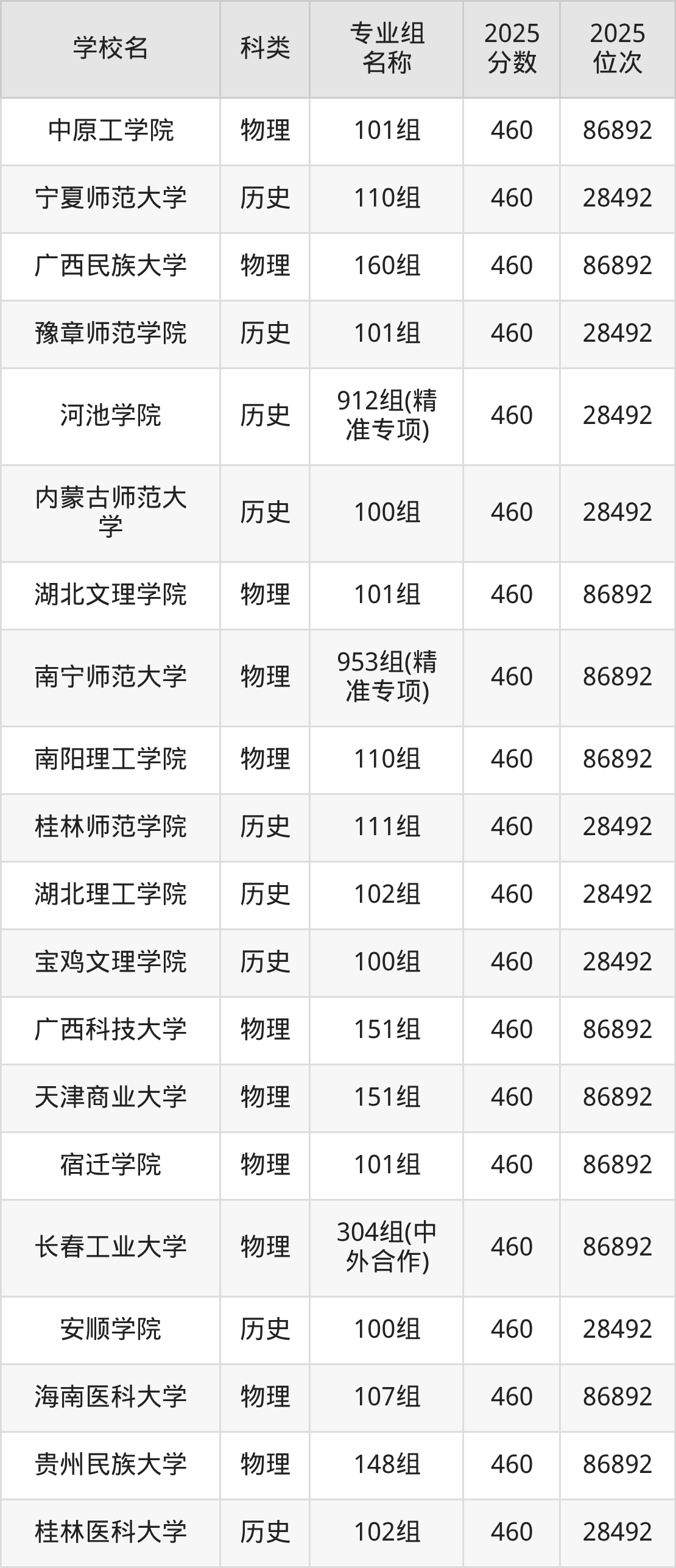 除上述院校外,460分可上的公办本科大学还有哈尔滨医科大学(157组454分,位次92076名)、广西科技大学(162组452分,位次93926名)。