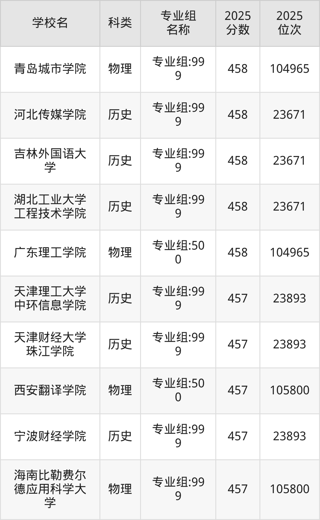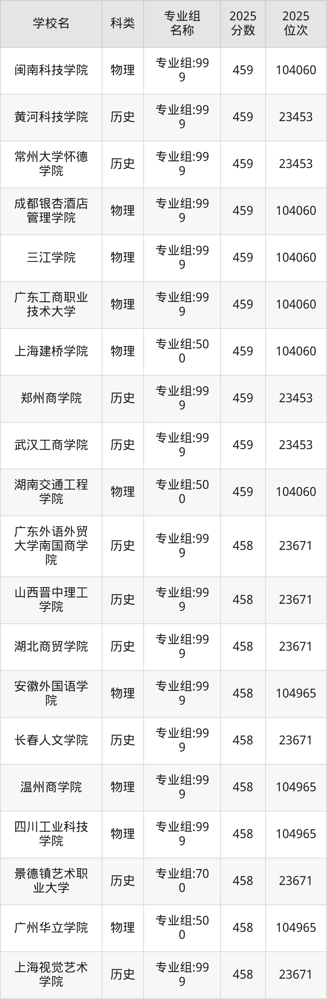 而位次最低的民办院校有文华学院(101组)、无锡太湖学院(101组)、南通理工学院(102组)、武汉设计工程学院(105组),分数为402分,对应最低位次排名为53085名。