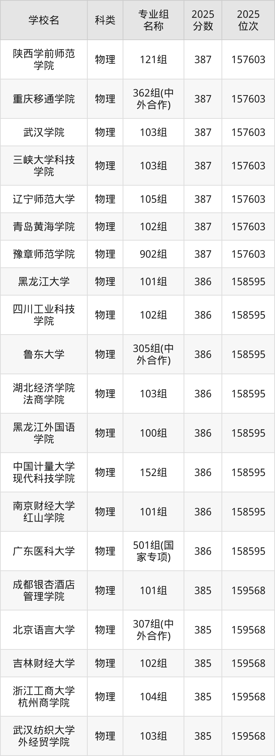 2025年贵州物理类本科线为387分,压线能上的本科大学共计25所,对应大学最低位次排名为157347名。民办大学有浙江树人学院、海南科技职业大学、上海中侨职业技术大学、西安翻译学院等。