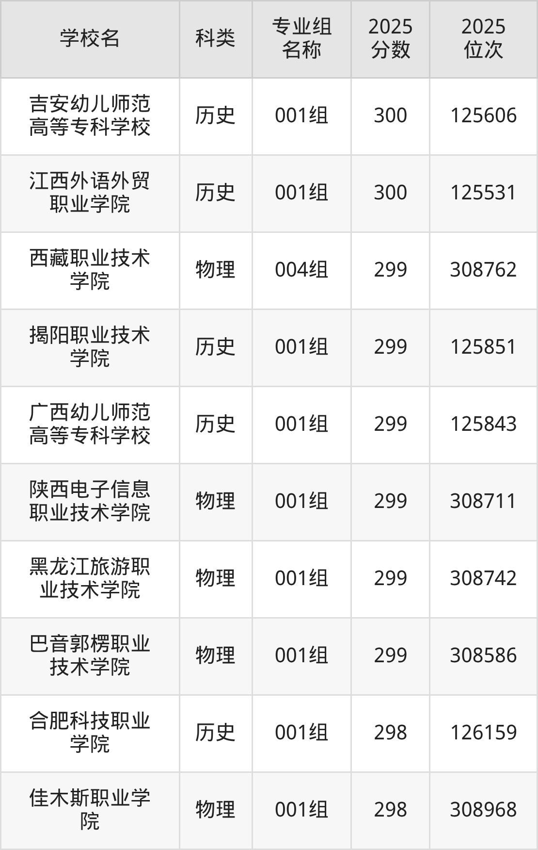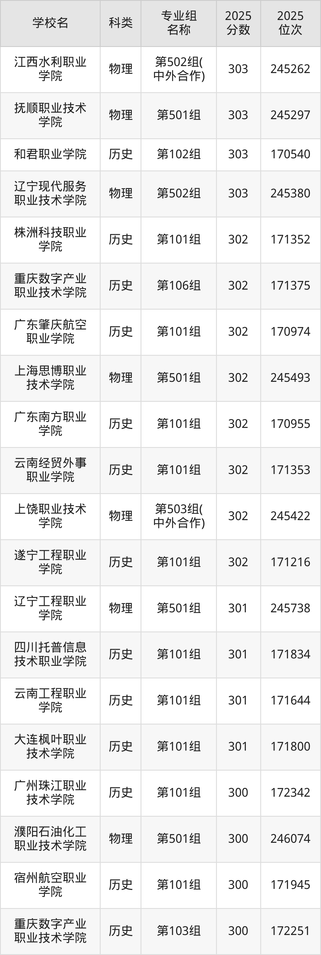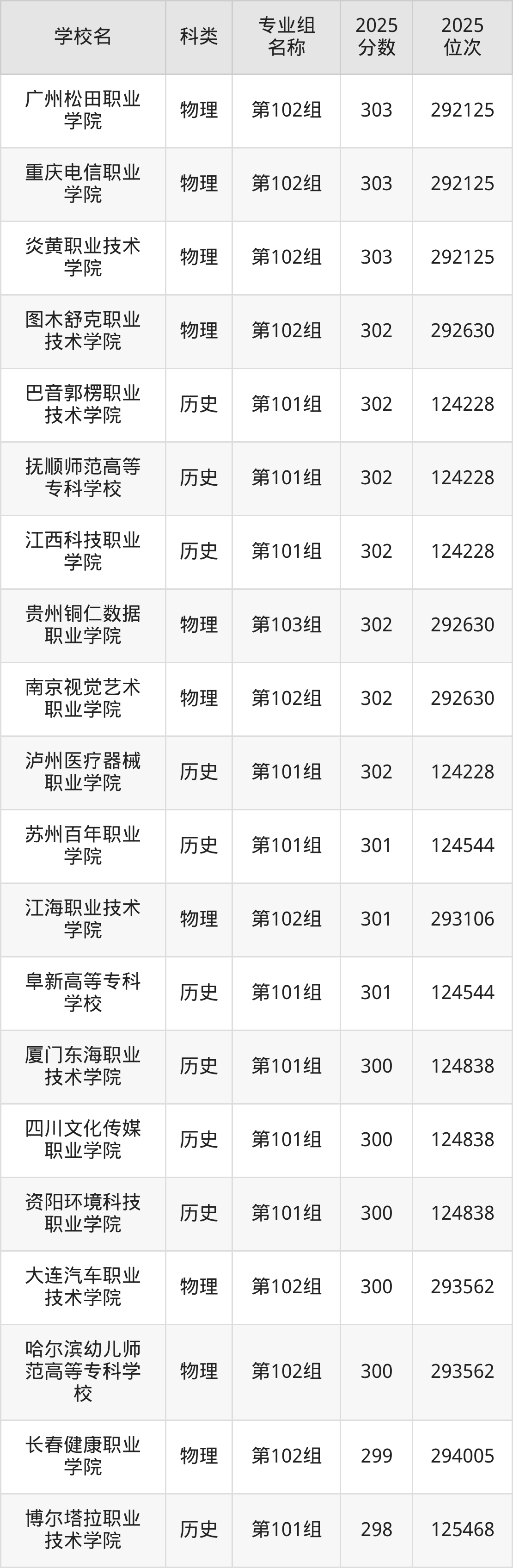 除上述院校外,306分可上的公办专科学校还有黔东南民族职业技术学院(第501组266分,位次254715名)、新疆应用职业技术学院(第501组240分,位次259802名)。