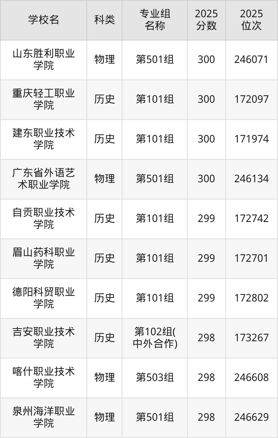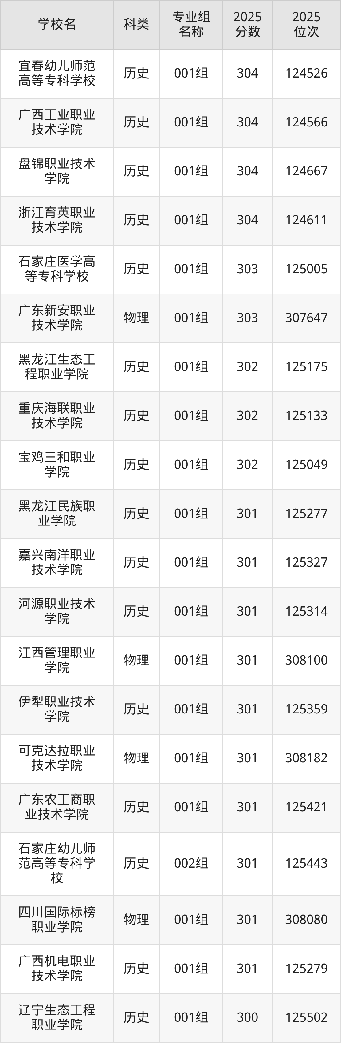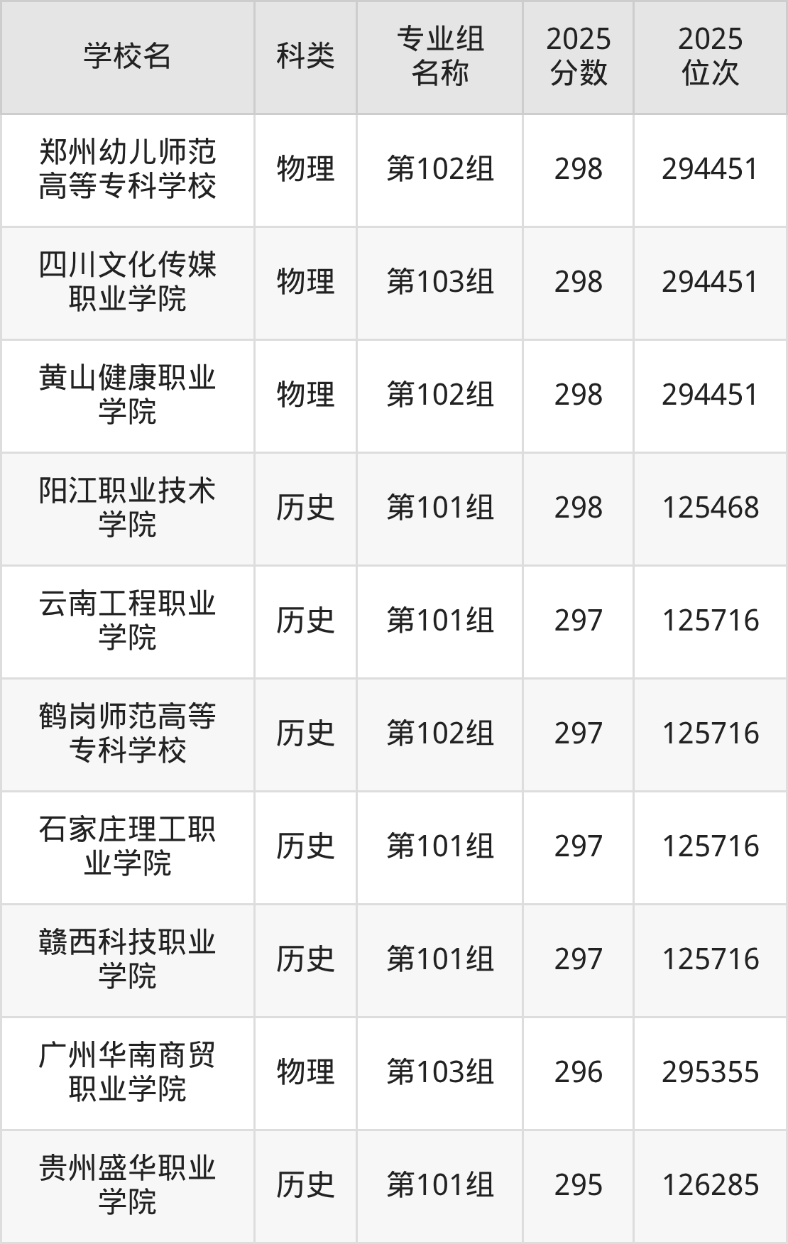 除上述院校外,306分可上的公办专科学校还有黔东南民族职业技术学院(第501组266分,位次254715名)、新疆应用职业技术学院(第501组240分,位次259802名)。