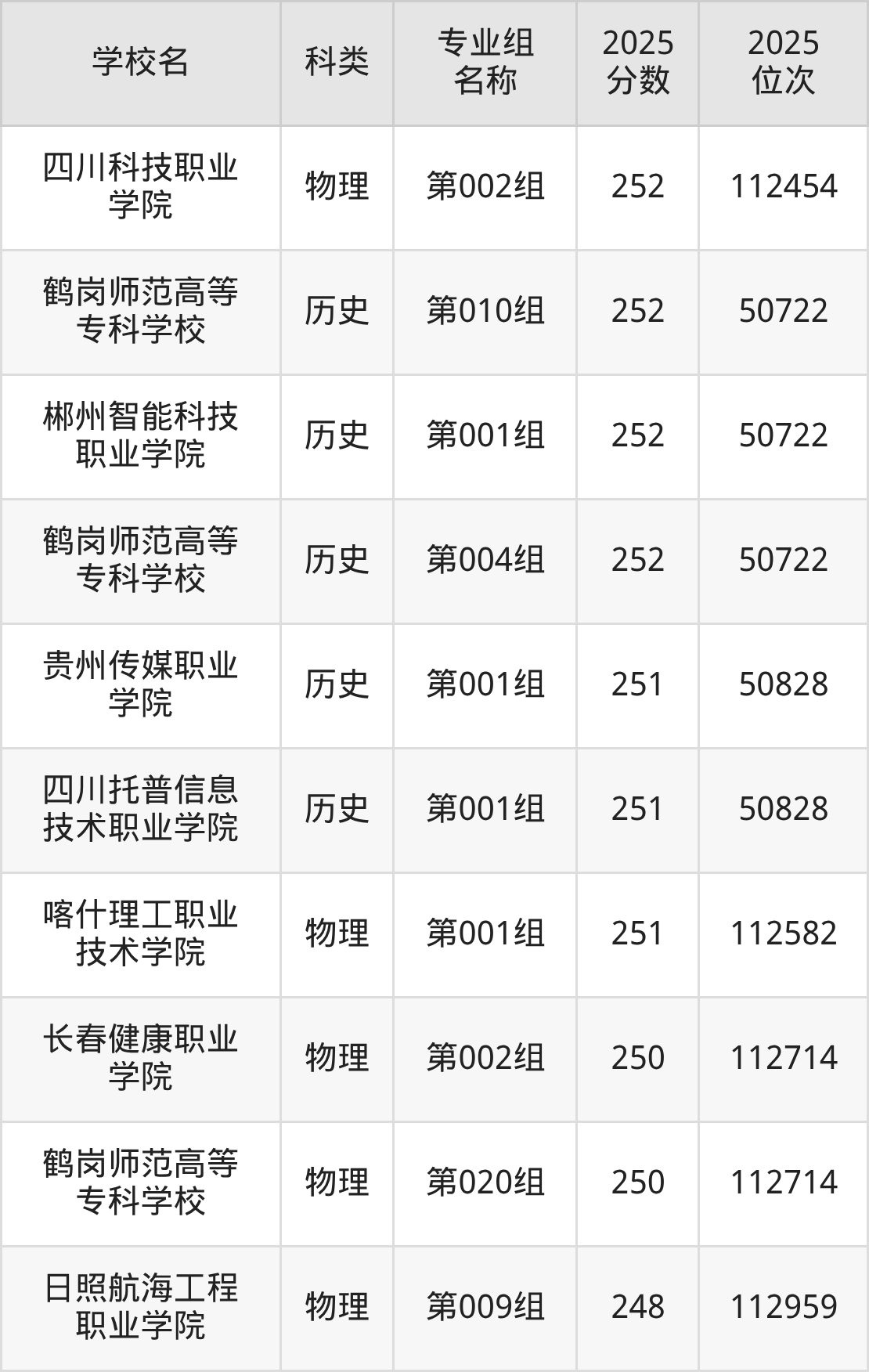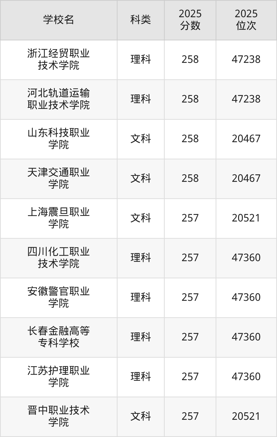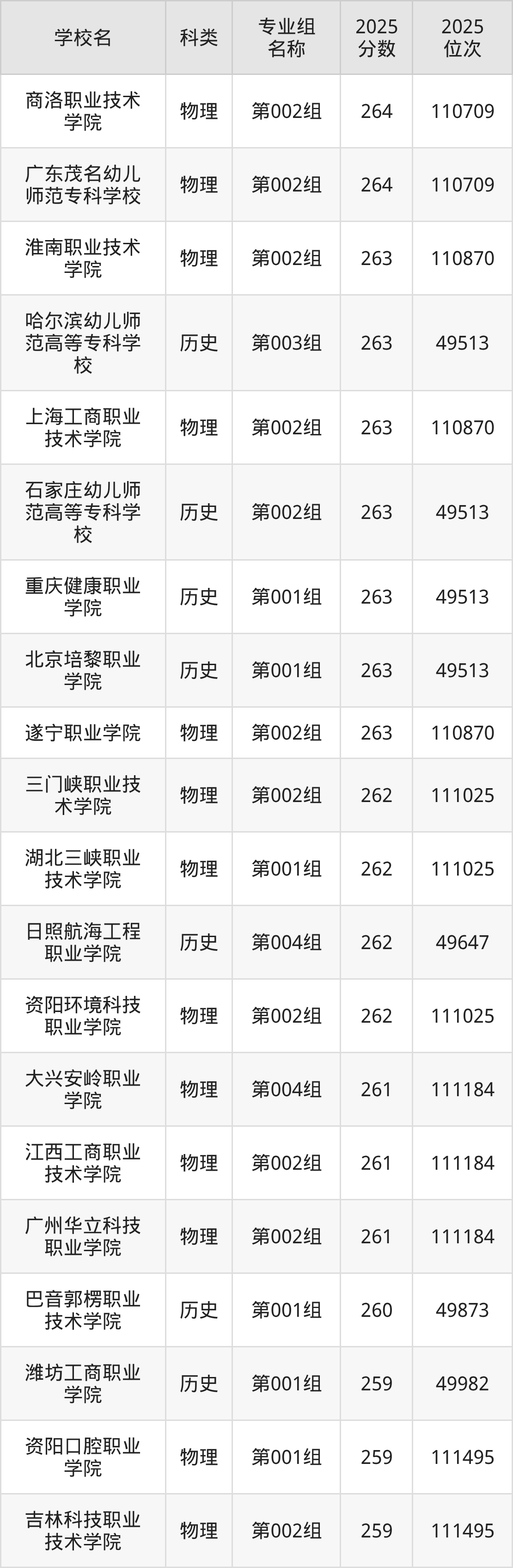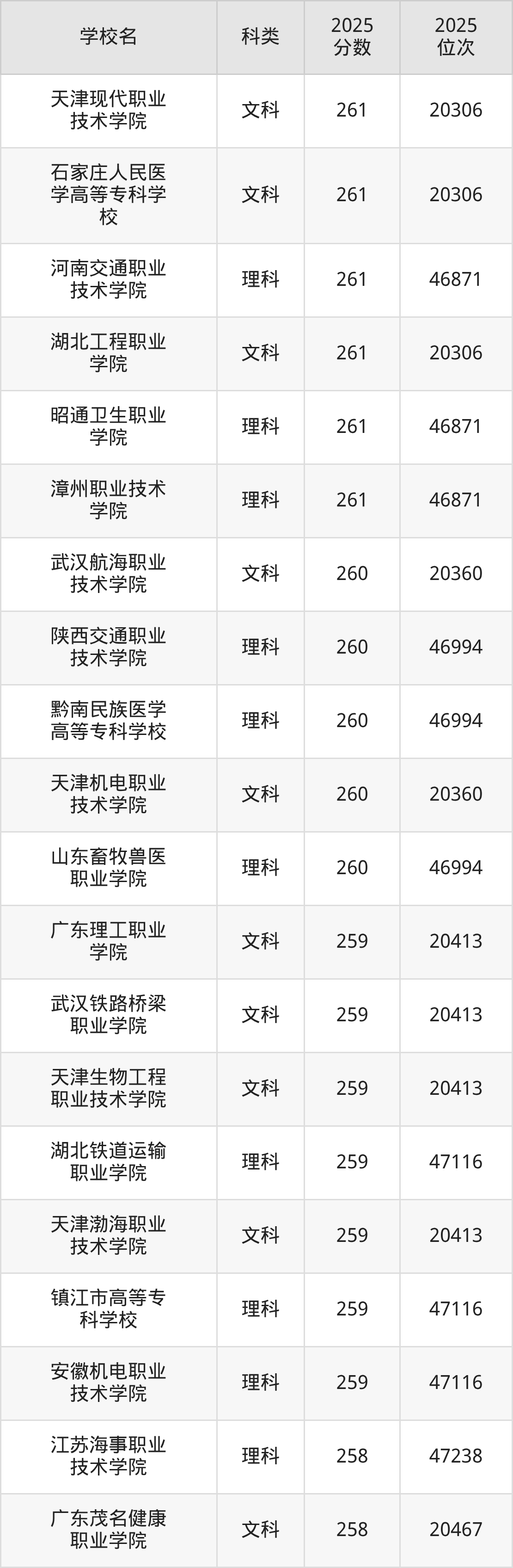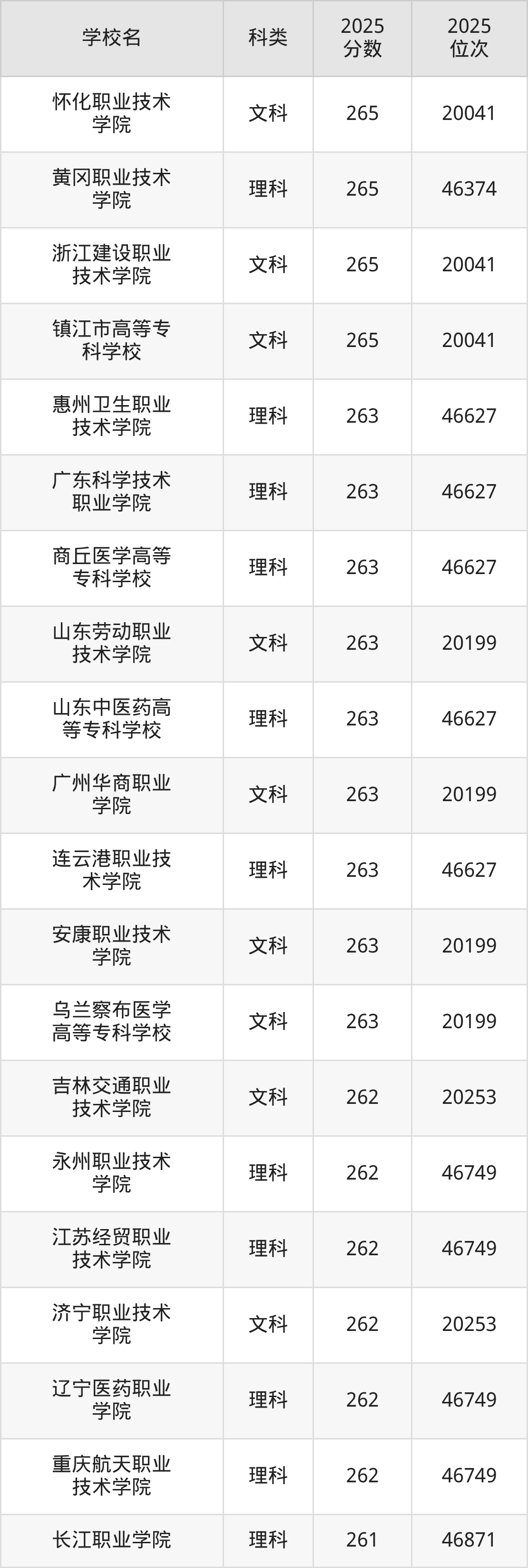 本文将收集各省265分能上的专科学校位次排名表(不含特殊招生计划、中外合作、分校区等),以供2026届考生参考。