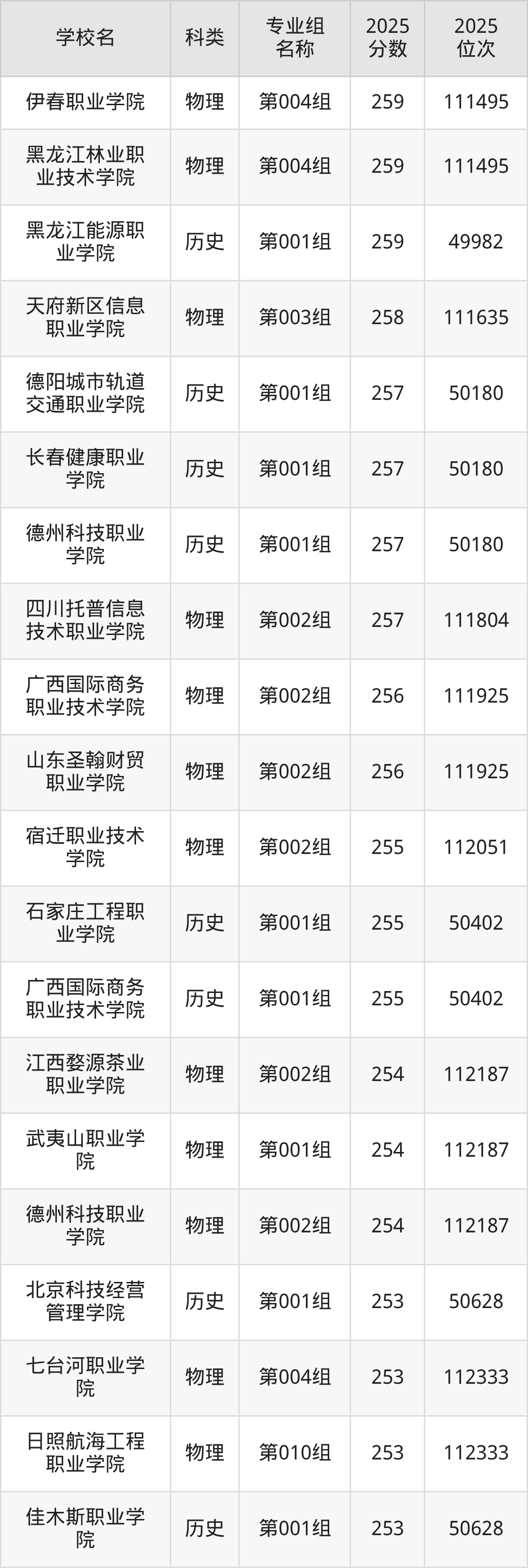 除上述院校外,265分可上的公办专科学校还有广东理工职业学院(259分,位次20413名)、四川邮电职业技术学院(192分,位次52116名)。