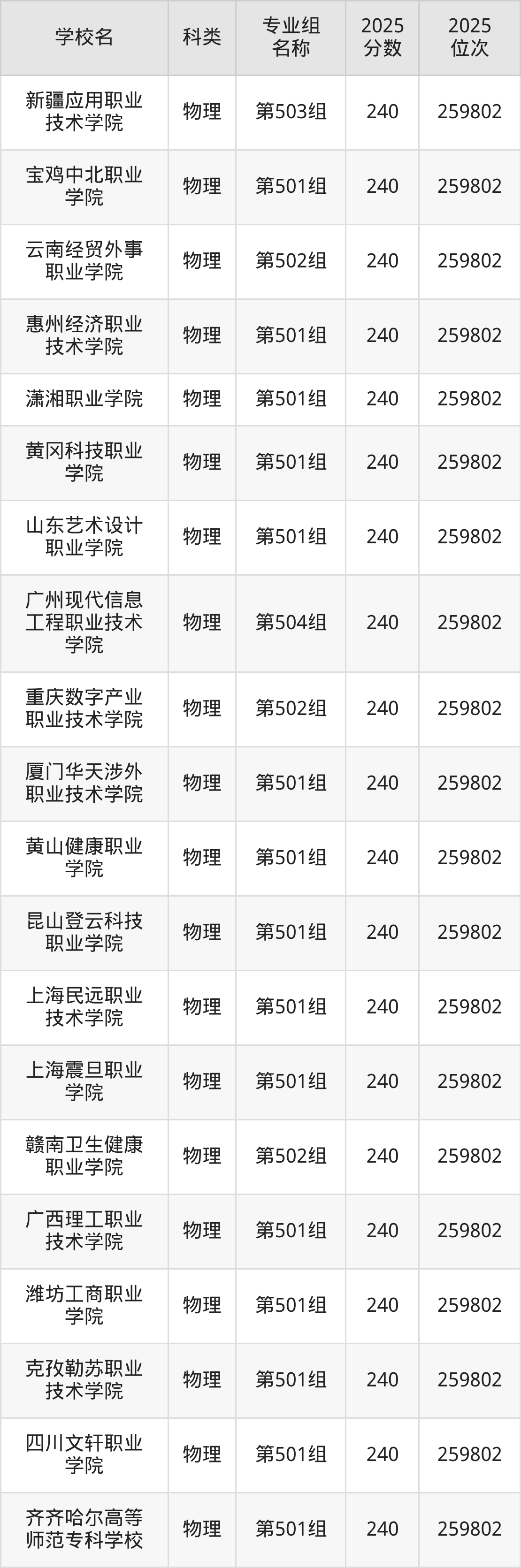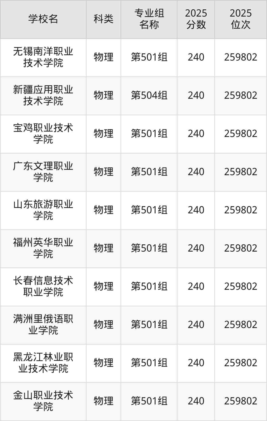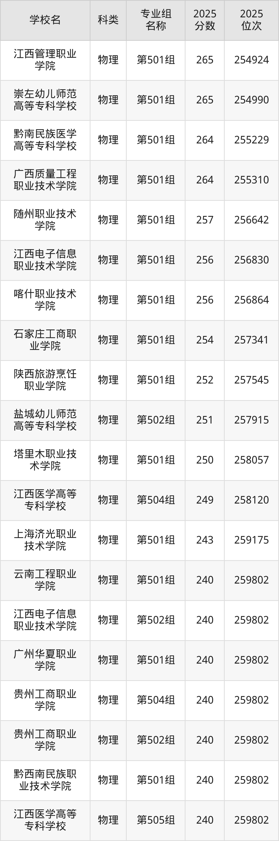2025年江西物理类专科线为240分,265分能上的专科学校共计296所,其中公办大学录取位次排名最低的是辽宁轻工职业学院(第502组240分,位次259802名),即代表考生省排名位次在259802名及以内就可以报考公办专科。
