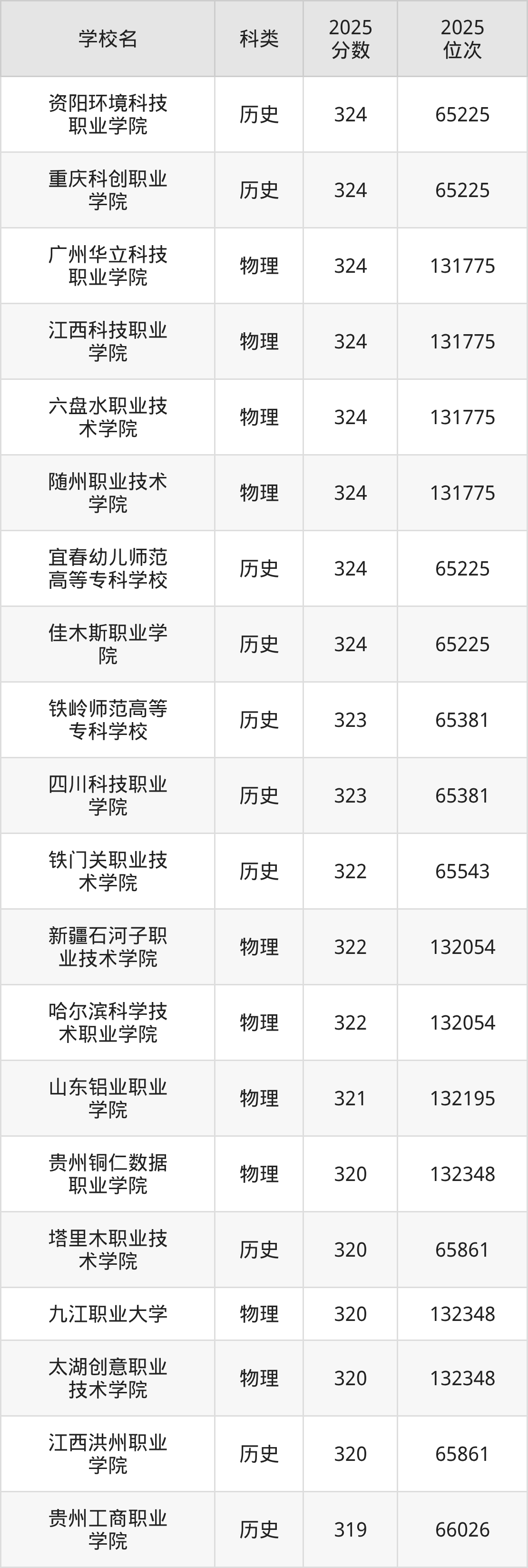 以重庆历史类为例,324分能上的专科学校有广西理工职业技术学院(位次排名70213名)、四川文化传媒职业学院(位次排名71329名)、烟台黄金职业学院(位次排名73373名)。