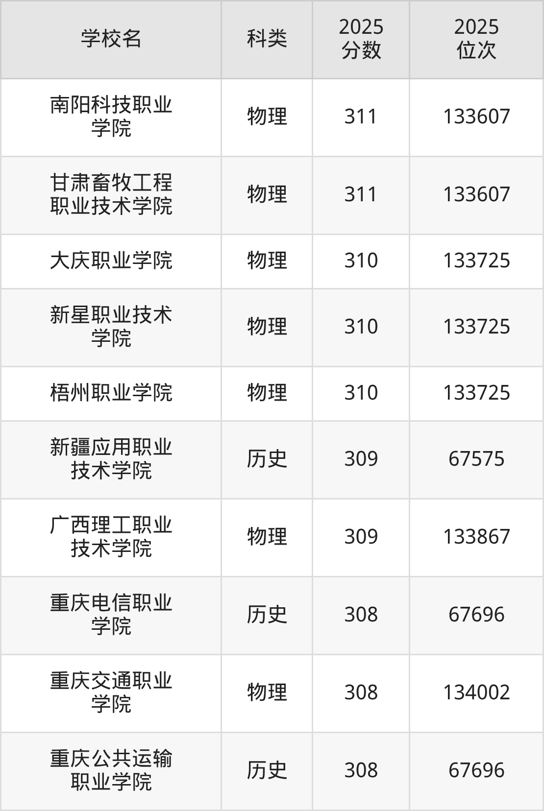 2025年重庆历史类专科线为180分,324分能上的专科学校共计128所,其中公办大学录取位次排名最低的是苏州百年职业学院(180分),其2025最低位次为73373名。