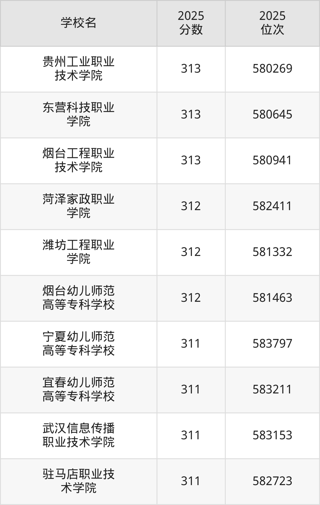 2025年山东二段线为150分,324分能上的专科学校共计407所,其中公办大学录取位次排名最低的是烟台文化旅游职业学院(155分,位次680615名),即代表考生省排名位次在680615名及以内就可以报考公办专科。