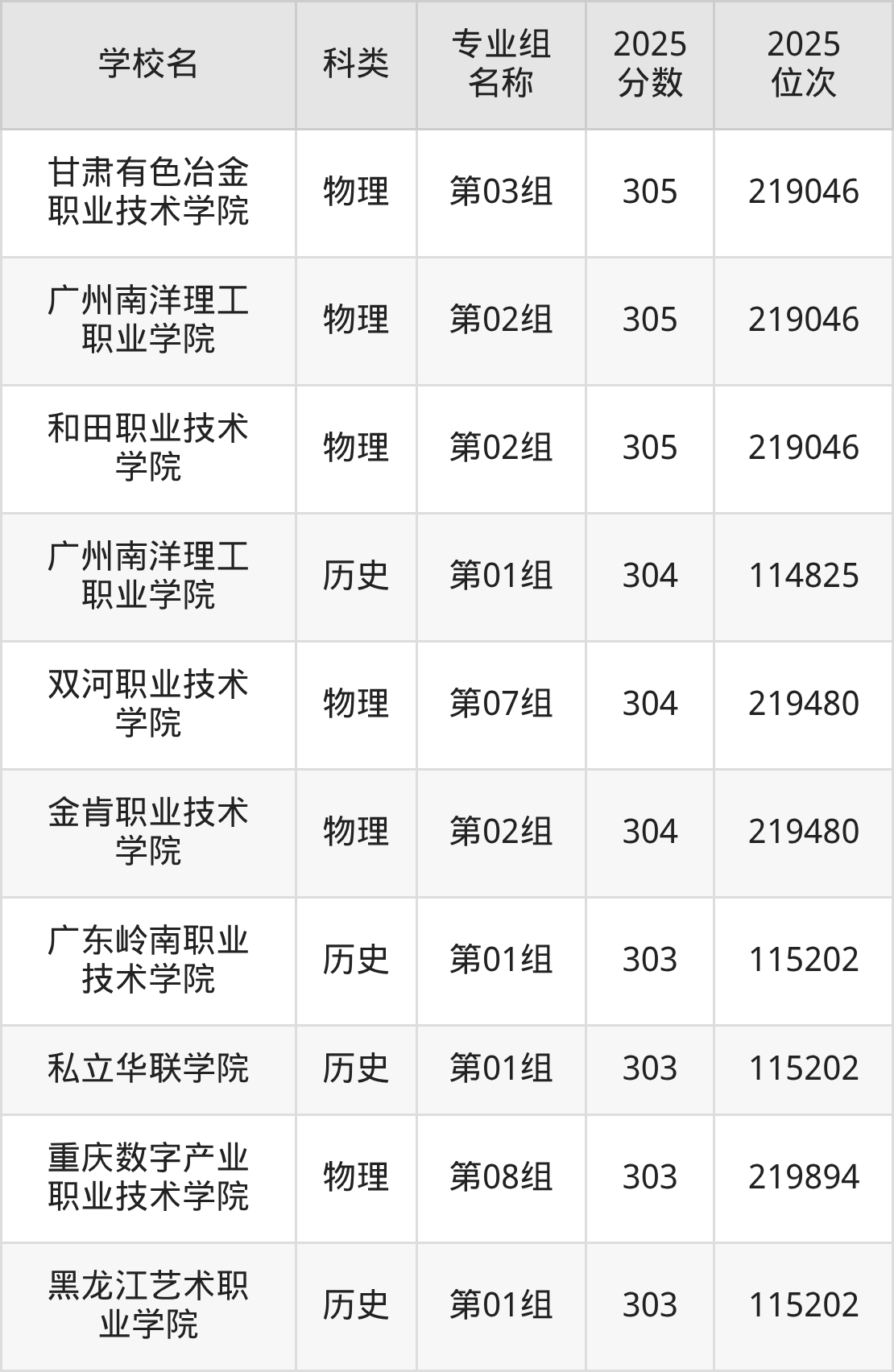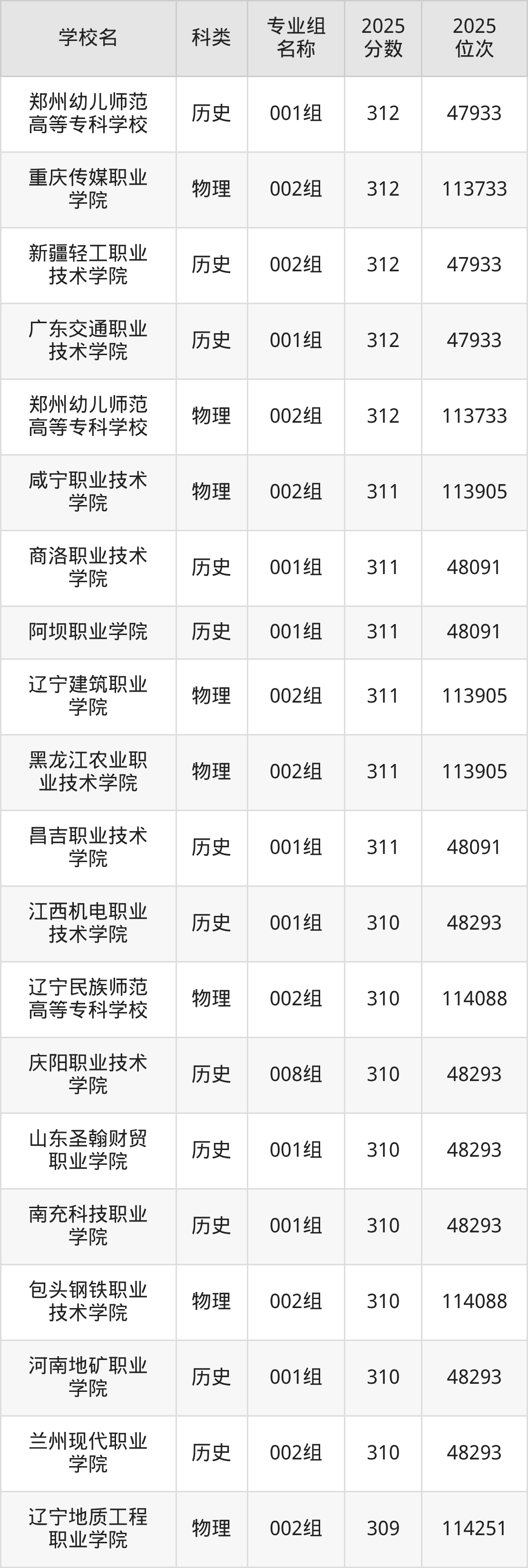除上述院校外,315分可上的公办专科学校还有黑龙江农垦职业学院(001组194分,位次56808名)、柳州城市职业学院(001组306分,位次49006名)。