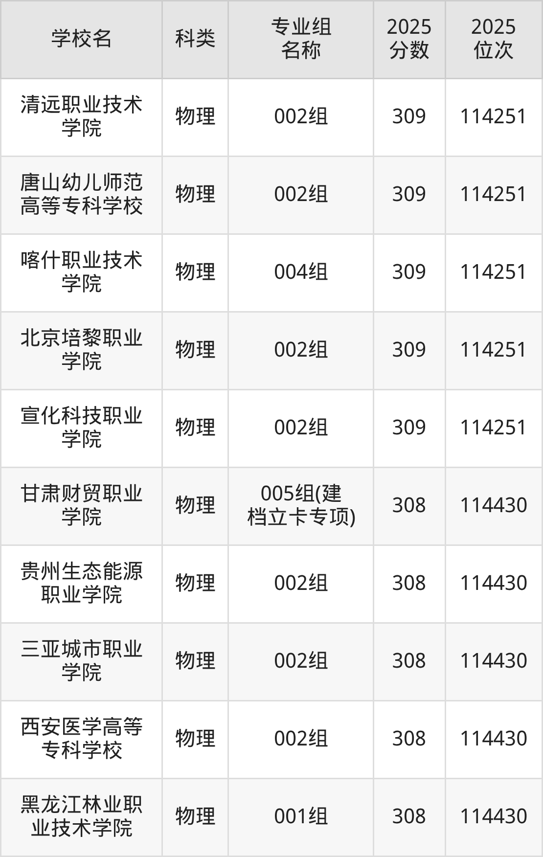 2025年甘肃物理类专科线为180分,315分能上的专科学校共计272所,其中最低分公办院校为庆阳职业技术学院(030组(建档立卡专项)180分),对应最低位次为120677名。因此想上公办专科的考生省排名位次至少要在120677名以内。