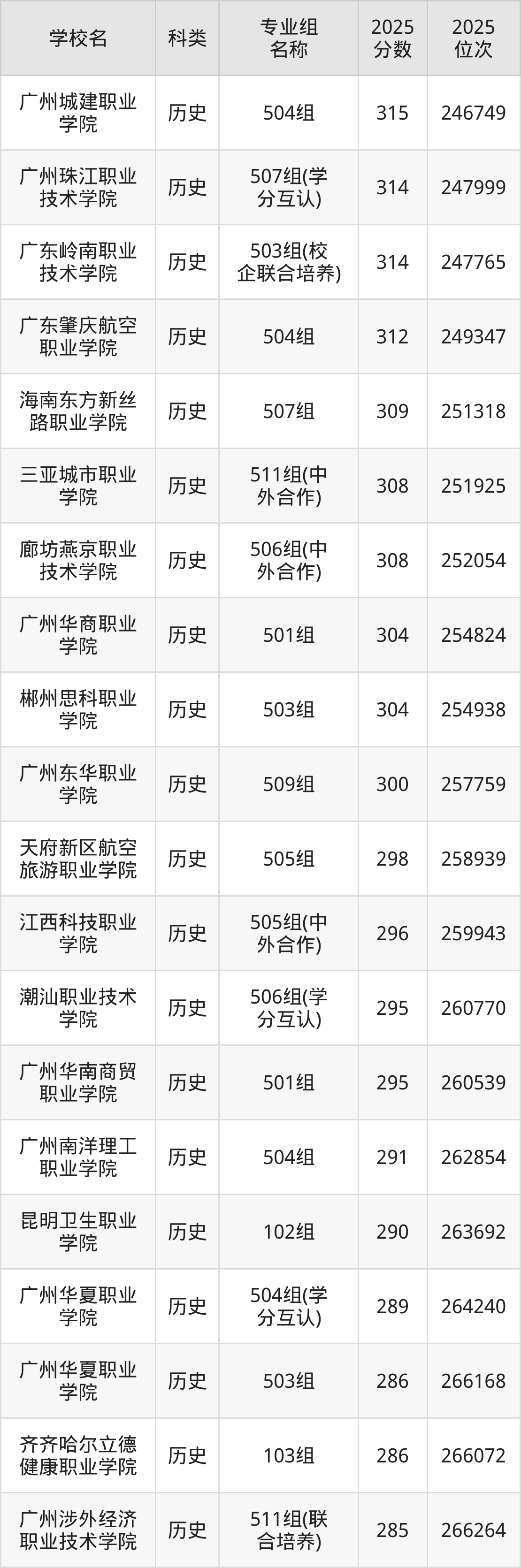 2025年广东历史类专科线为215分,315分能上的专科学校共计30所,其中公办大学录取位次排名最低的是廊坊燕京职业技术学院(506组(中外合作)308分),其2025最低位次为252054名。