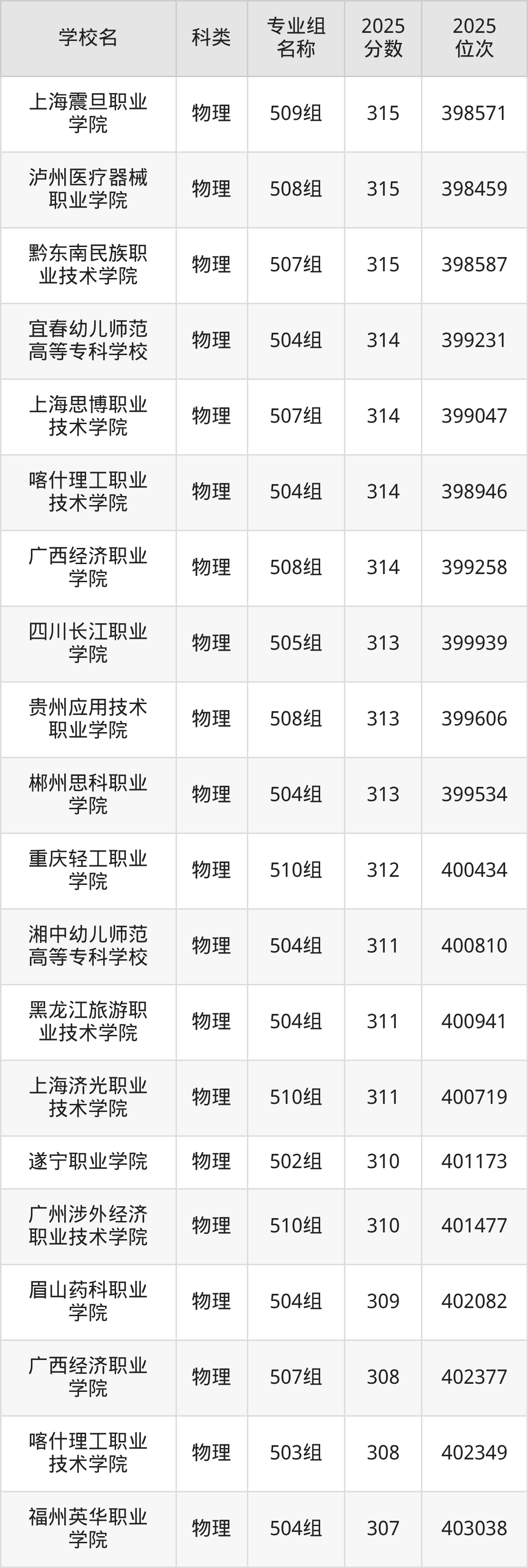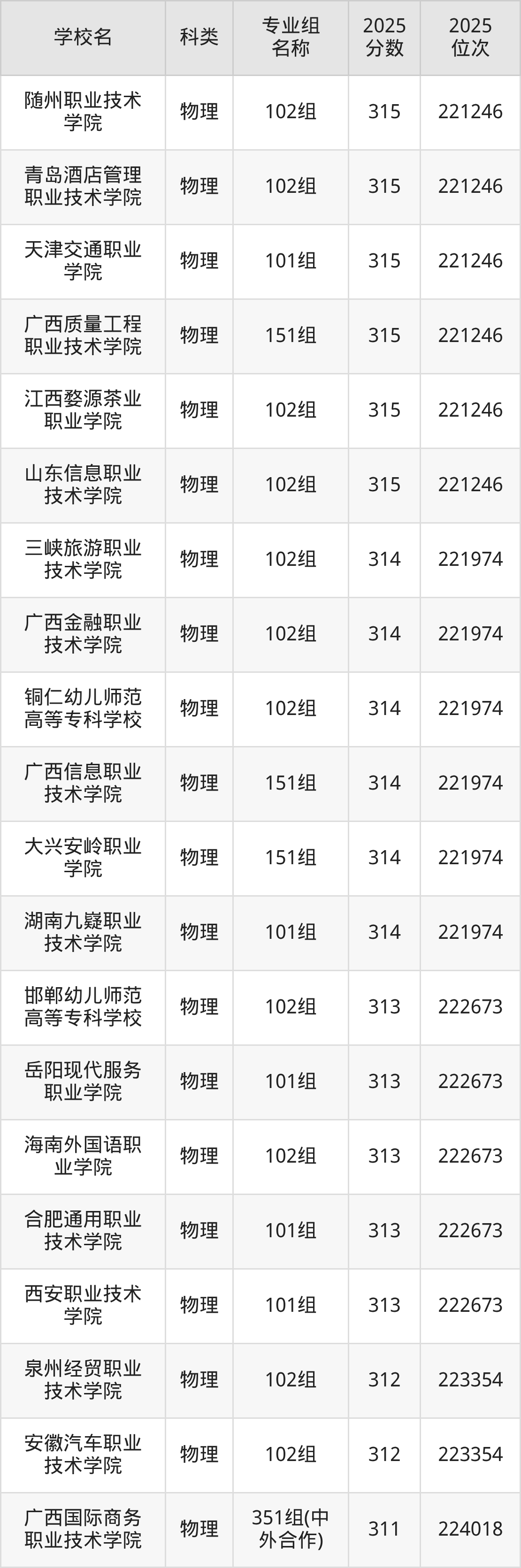 以广东物理类为例,315分能上的专科学校有广州南洋理工职业学院(位次排名406376名)、广州城建职业学院(位次排名406975名)、泉州纺织服装职业学院(位次排名428521名)。