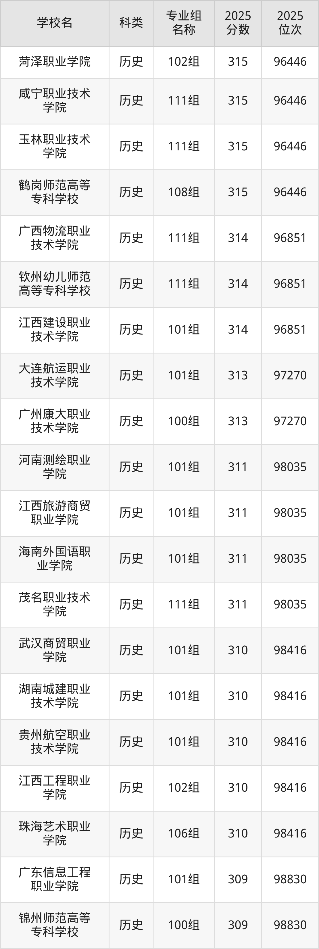 下面是广西历史类315分能上的专科学校排名Top20一览表: