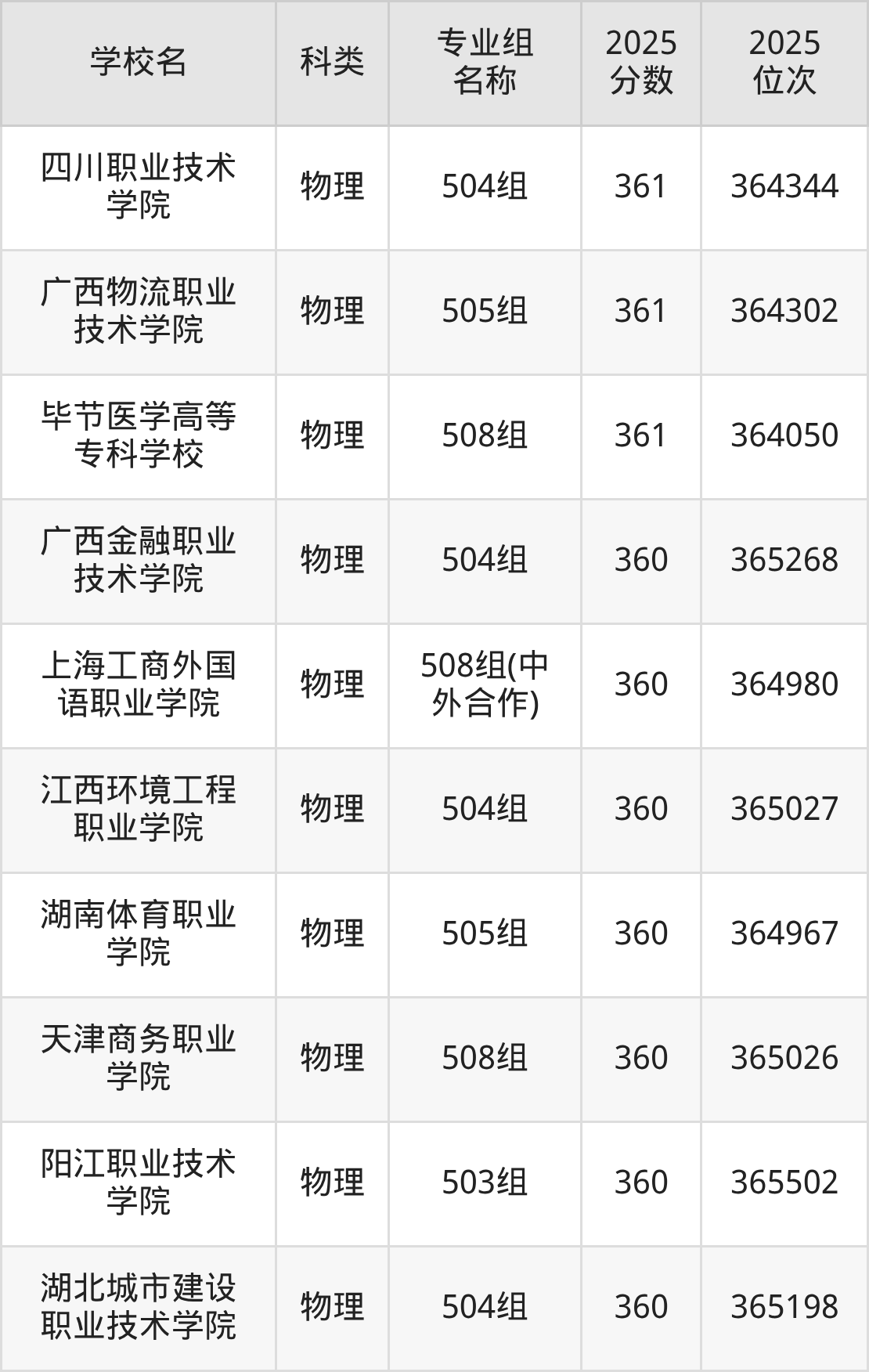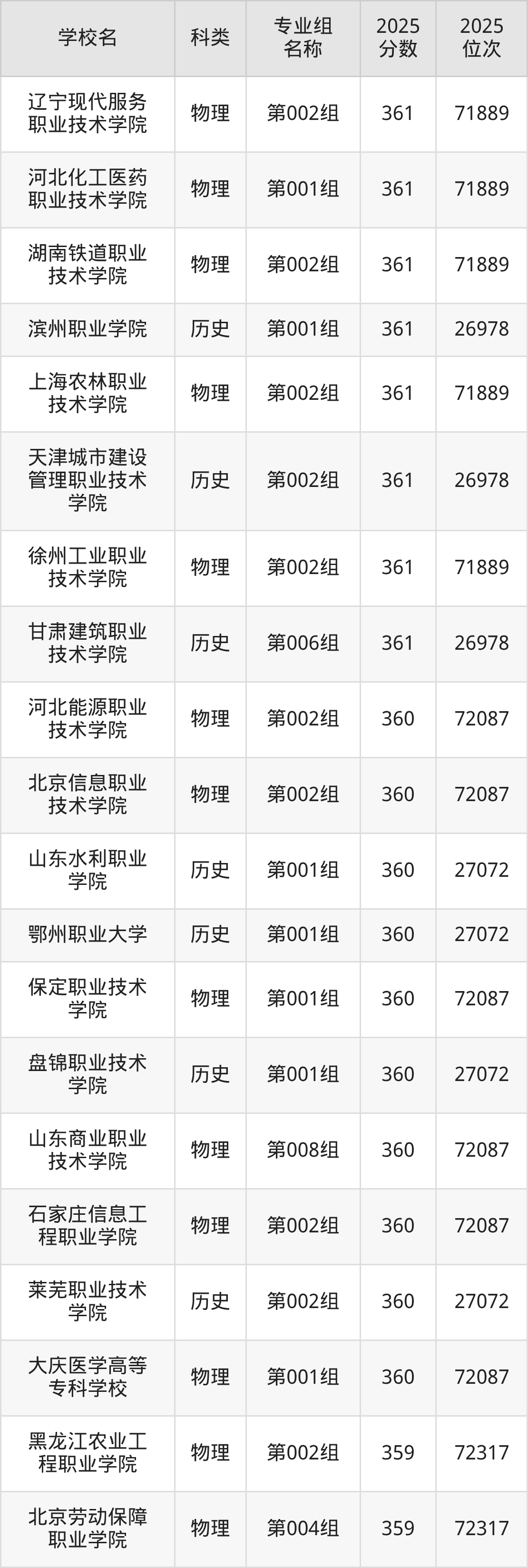 2025年内蒙古物理类专科线为160分,363分能上的专科学校共计398所,其中公办大学录取位次排名最低的是包头轻工职业技术学院(第201组200分,位次83716名),即代表考生自治区排名位次在83716名及以内就可以报考公办专科。