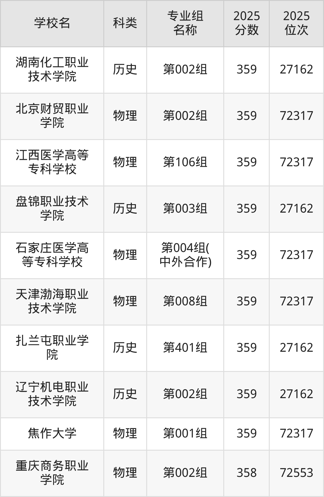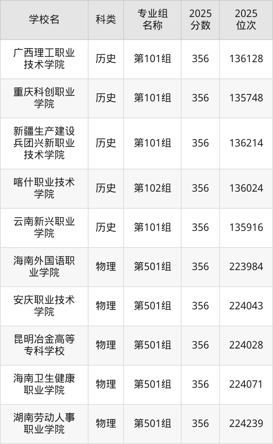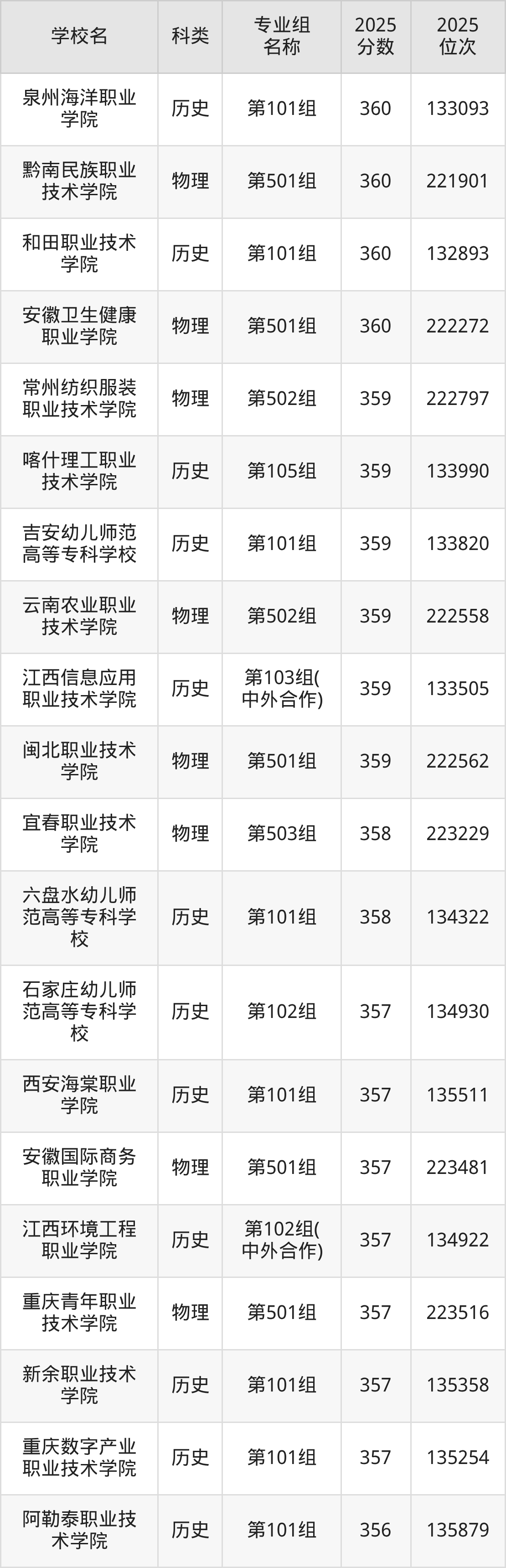 除上述院校外,363分可上的公办专科学校还有贵州航空职业技术学院(第101组363分,位次130843名)、萍乡卫生职业学院(第501组240分,位次259802名)。