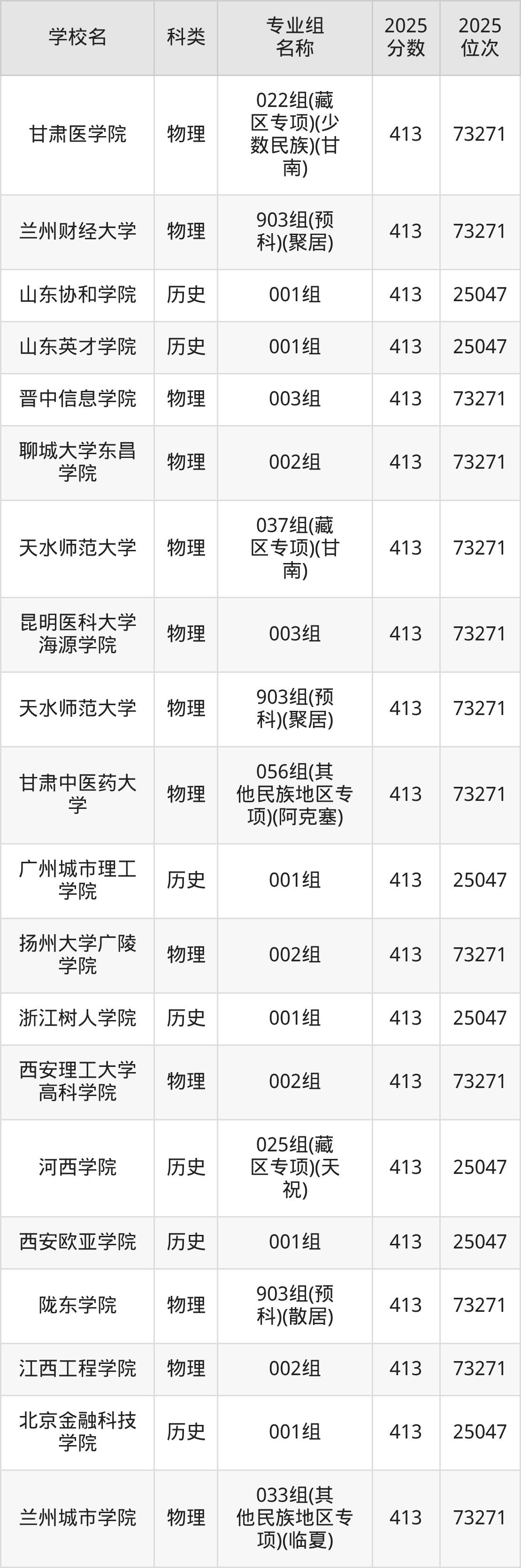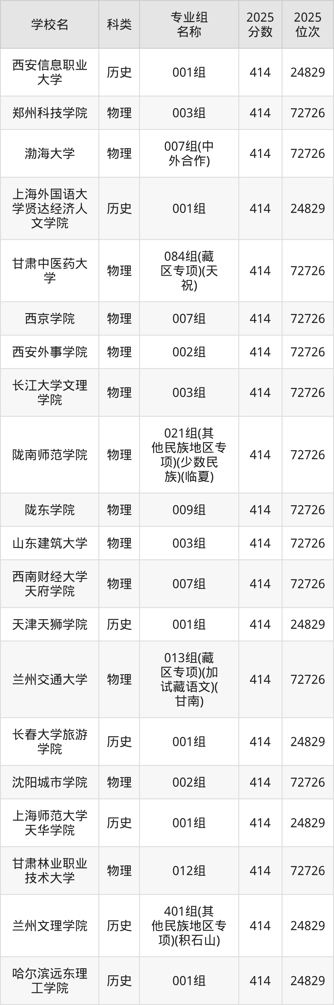 2025年甘肃历史类本科线为412分,414分能上的二本大学共计43所,其中公办大学录取位次排名最低的是甘肃林业职业技术大学(008组(藏区专项)(甘南)412分),其2025最低位次为25282名。