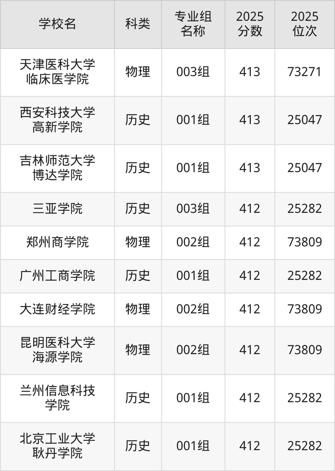 而民办大学录取位次排名最低的是北京工业大学耿丹学院(412分),其2025最低位次为25282名。