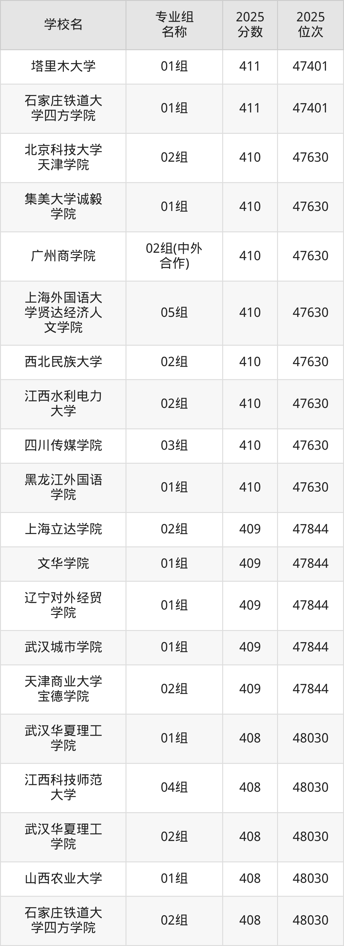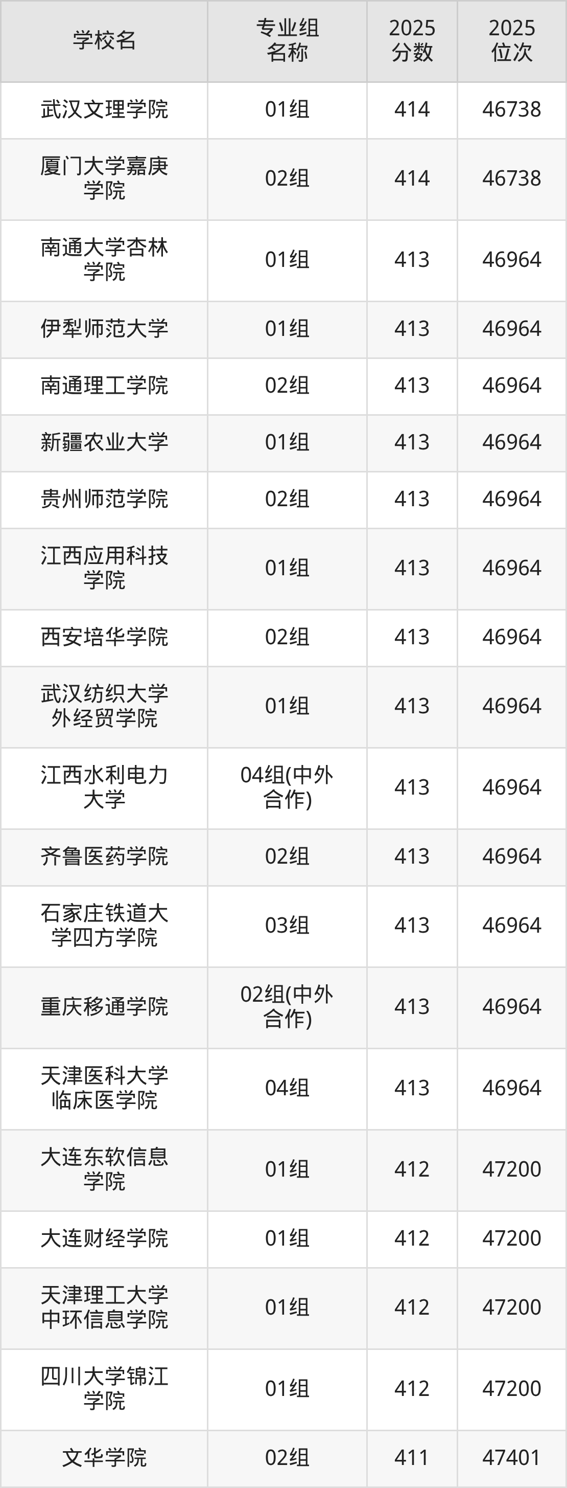 除上述院校外,414分可上的公办二本大学还有河套学院(第121组398分,位次61913名)、新疆和田学院(第005组405分,位次59699名)。