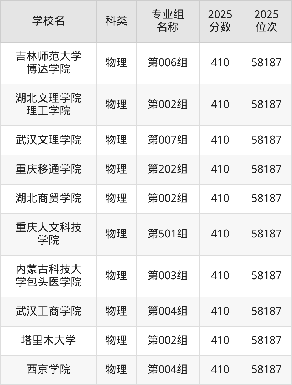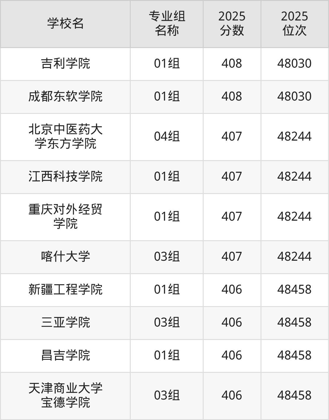 而位次最低的民办院校有黑龙江东方学院(第001组)、天津仁爱学院(第001组)、哈尔滨石油学院(第001组)、吉林建筑科技学院(第001组),分数为375分,对应最低位次排名为68528名。