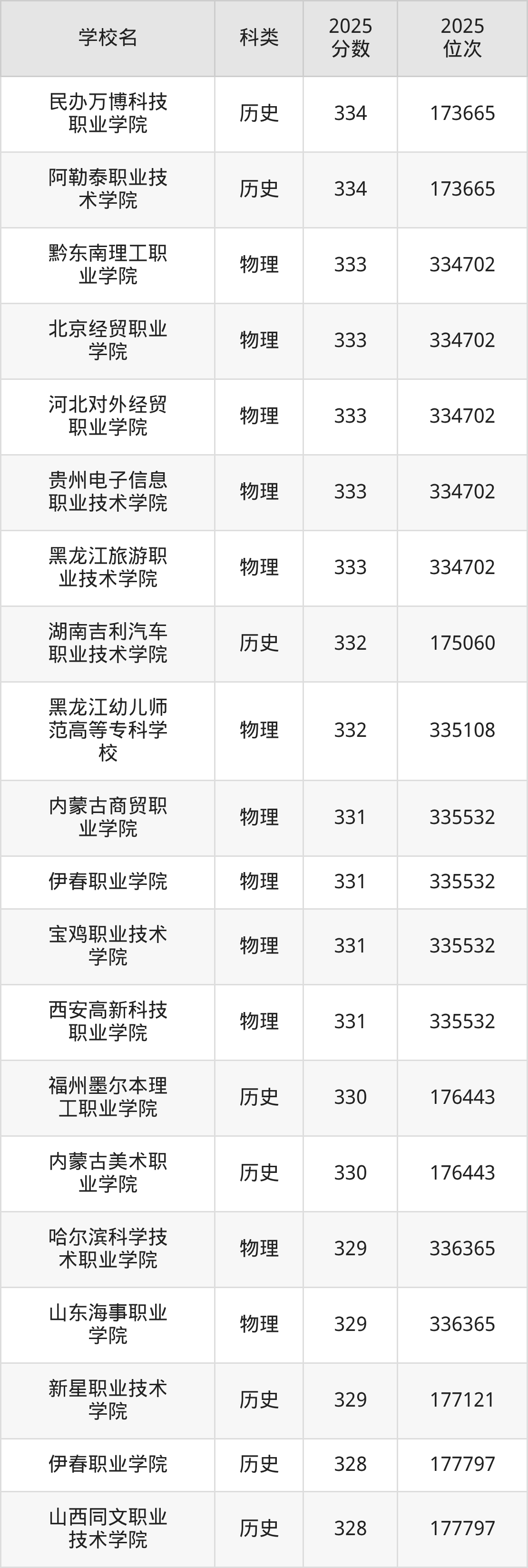 除上述院校外,339分可上的公办专科学校还有呼伦贝尔职业技术学院(278分,位次351685名)、新星职业技术学院(329分,位次177121名)。